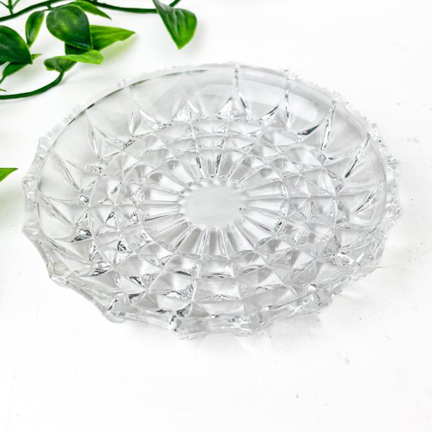 Lille vintage smørassiet i klart presset glas med stjernemønster og let bølget kant. Måler ca. 12 cm i diameter og 2 cm i højden.