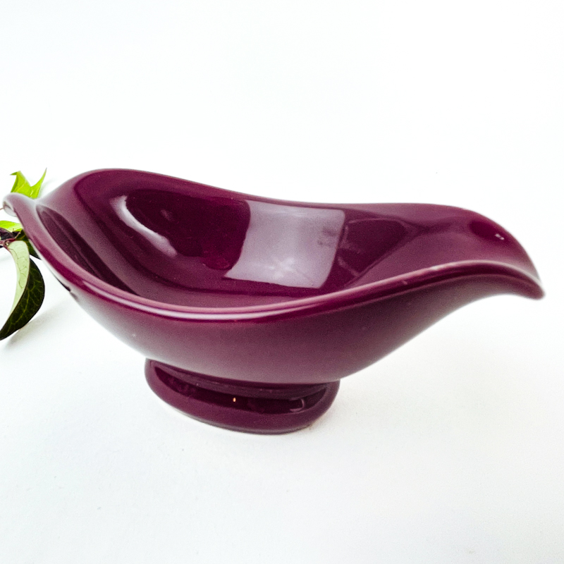Smuk vintage saucekande i glaseret fajance i dyb brombærfarve.
