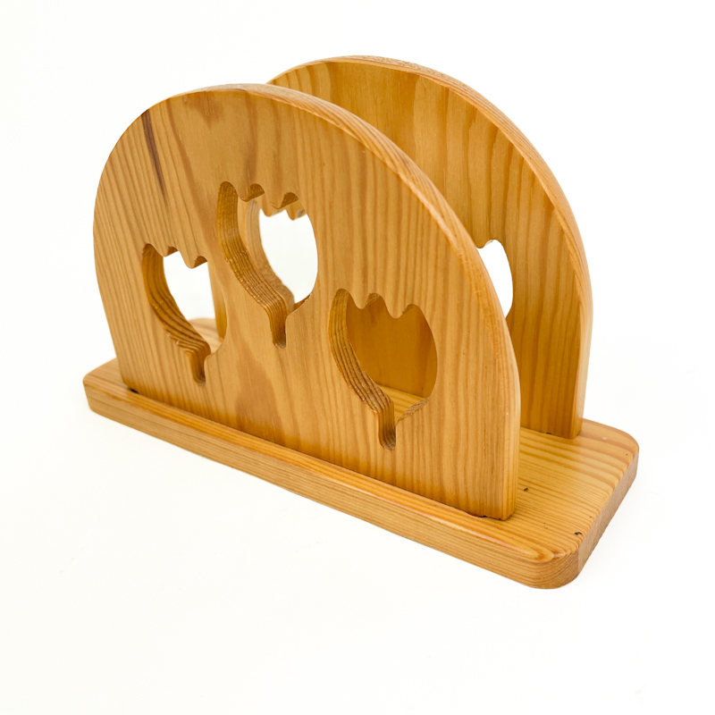 Retro servietholder i træ med udskårne tulipanmønstre og varm gylden tone.