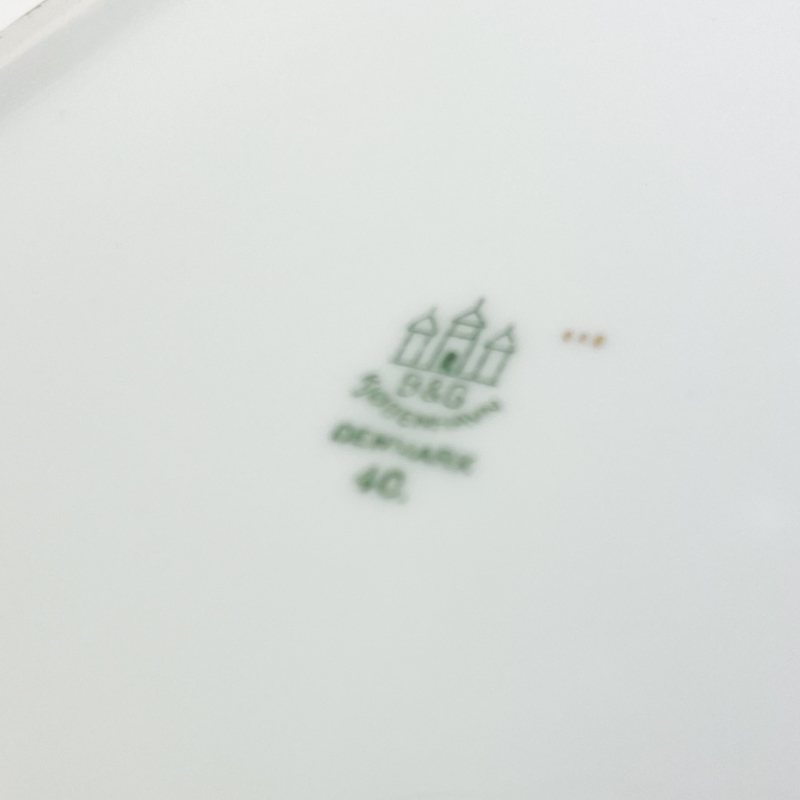 Produceret hos Bing & Grøndahl i Danmark med fint reliefmønster, håndmalede blomster og guldkant.
