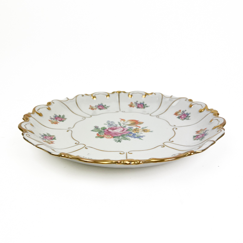 Smukt vintage fad i porcelæn med fin blomsterdekoration og guldkant.