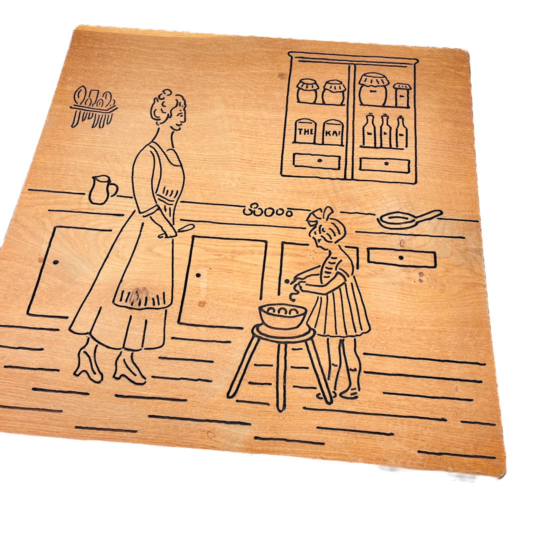 Flot retro skærebræt i træ med indgraveret motiv af mor og barn i køkkenet.