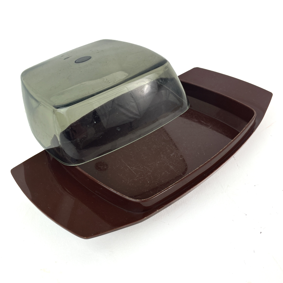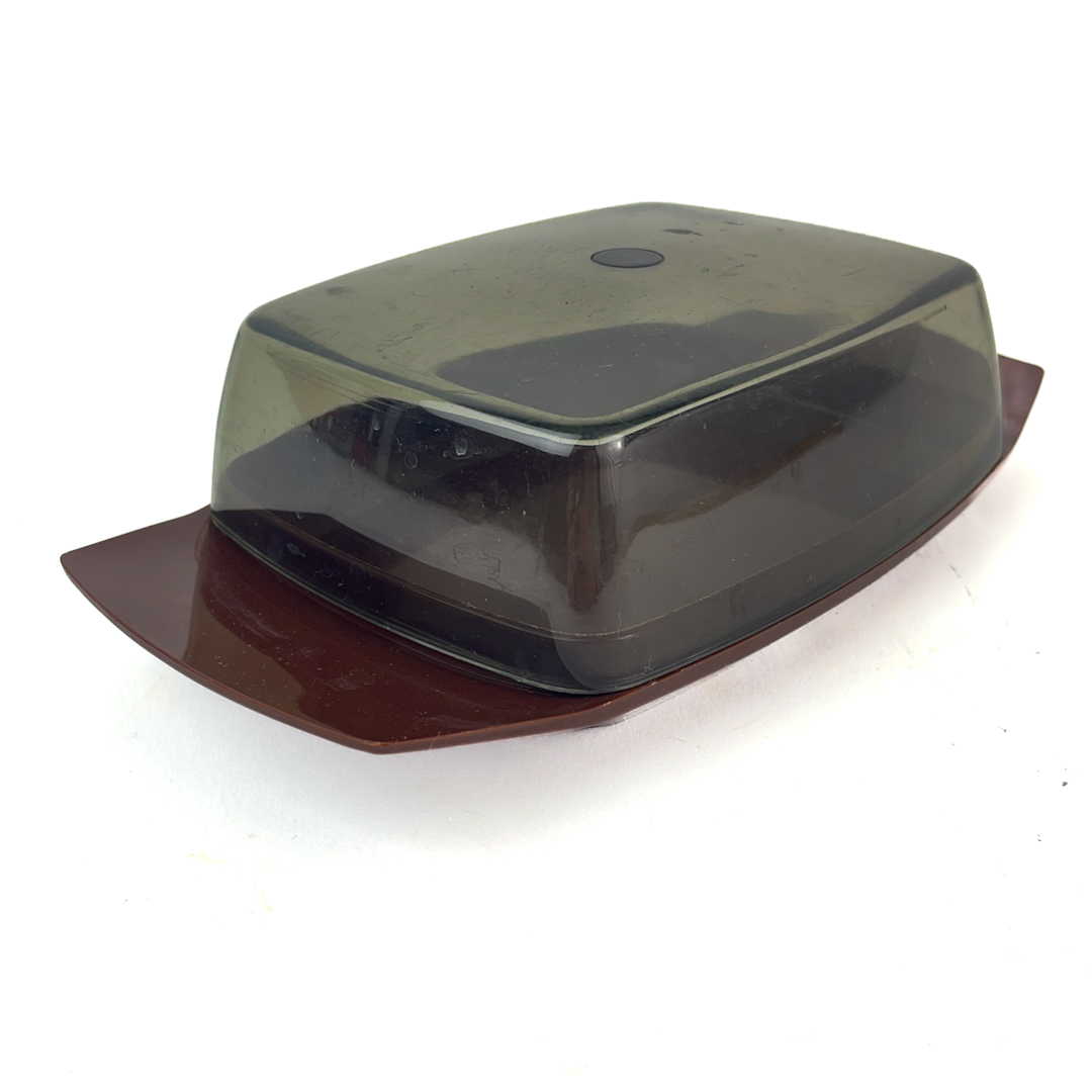 Klassisk retro smørboks med brunt fad og røgfarvet låg i elegant firkantet form.