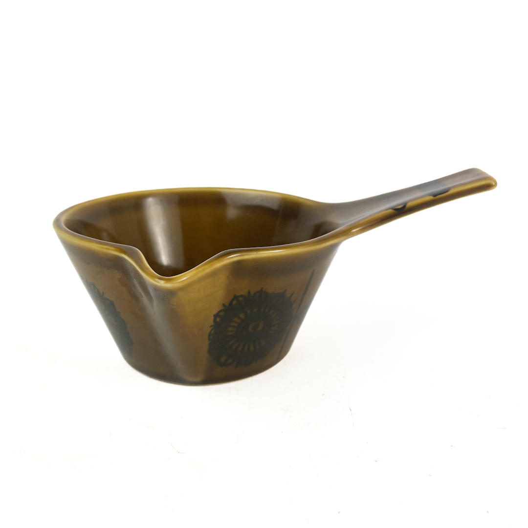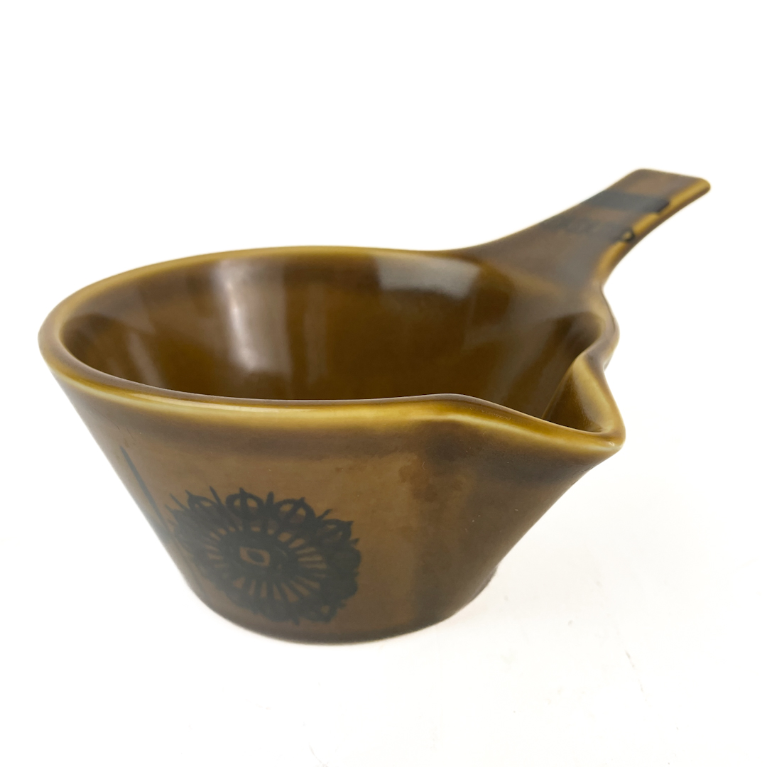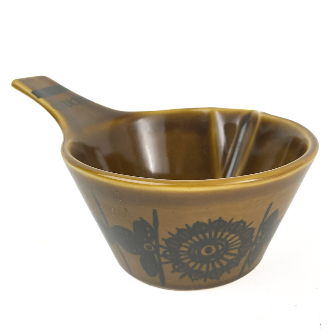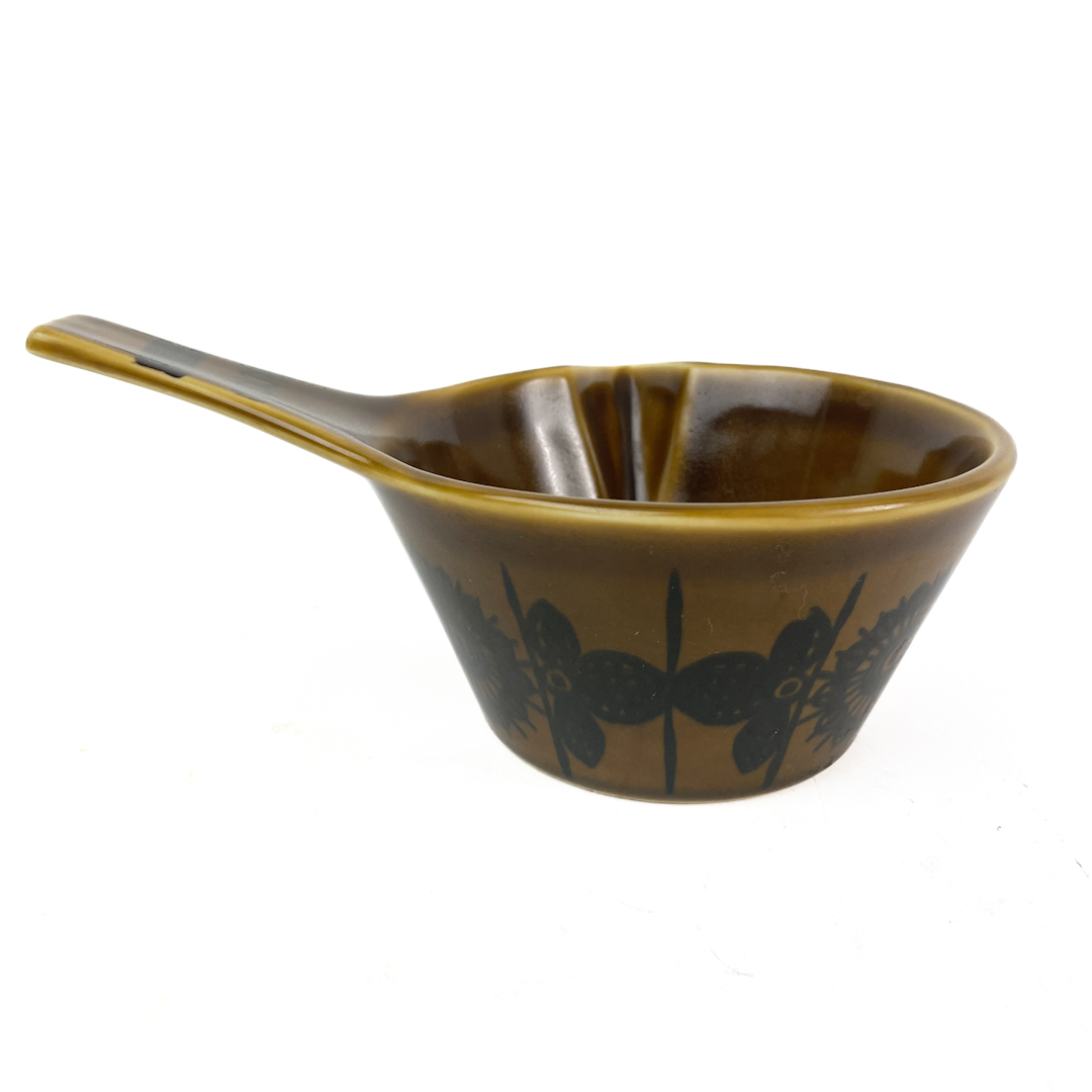 Designet har en olivengrøn glasur med sort blomsterdekoration i klassisk 60’er stil.