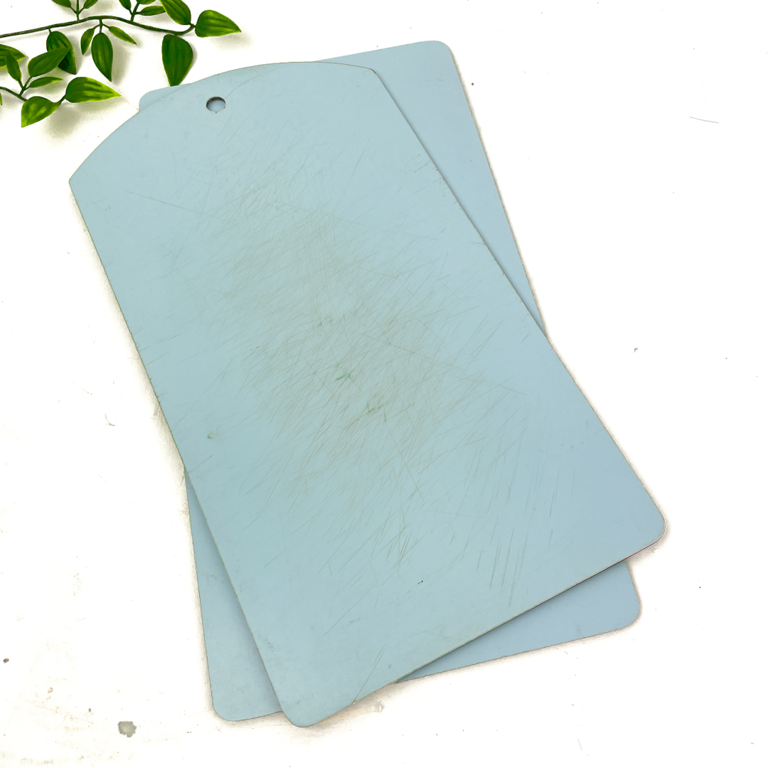 Ti lyseblå vintage smørebrikker og to skærebrædter
