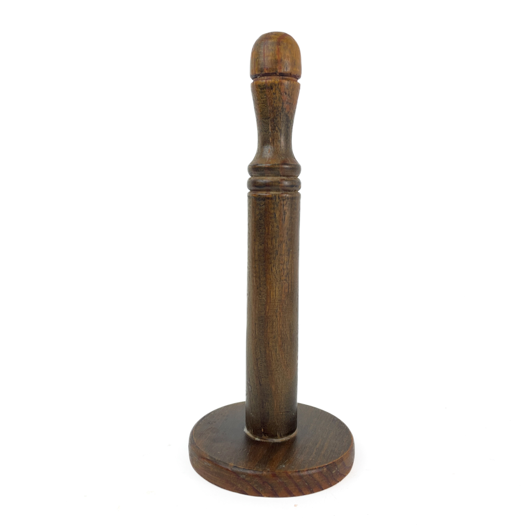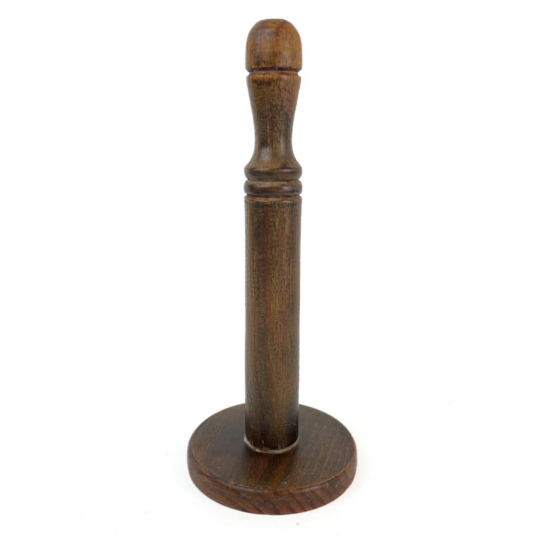 Klassisk køkkenrulleholder udført i massivt træ med drejet top og rund fod.