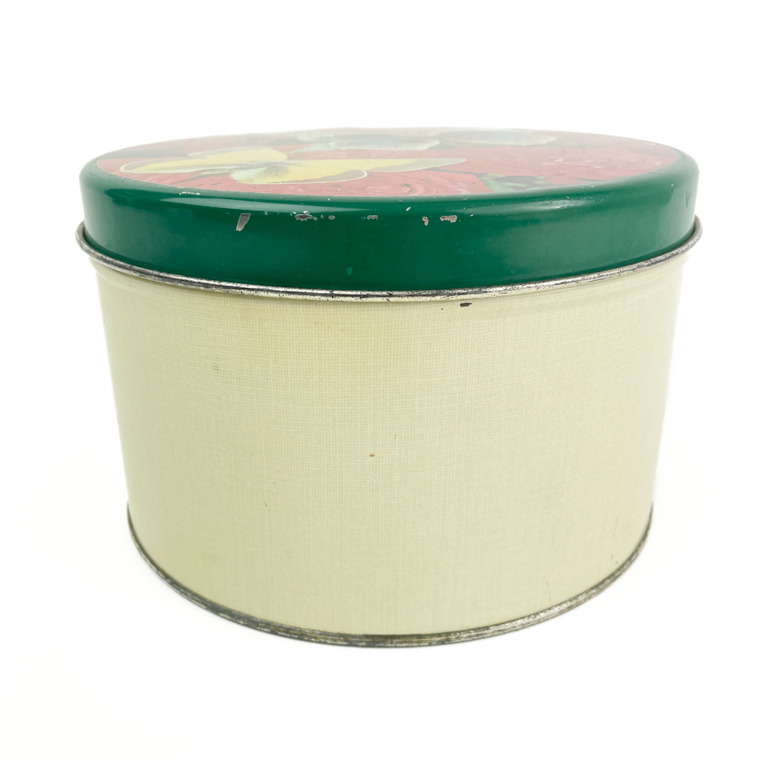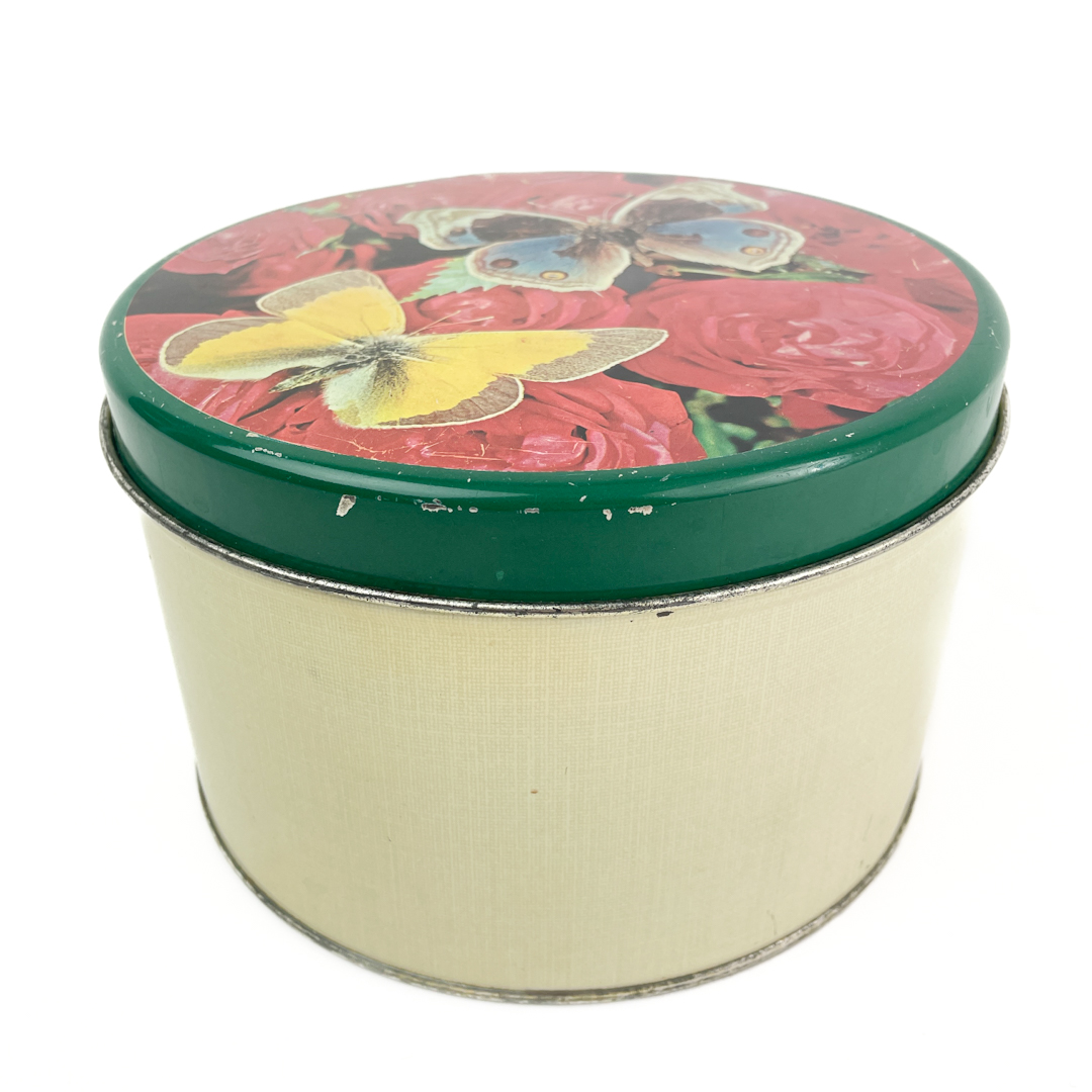 Fin rund vintage kagedåse i metal med grønt låg dekoreret med gule og blå sommerfugle på en bund af røde roser.