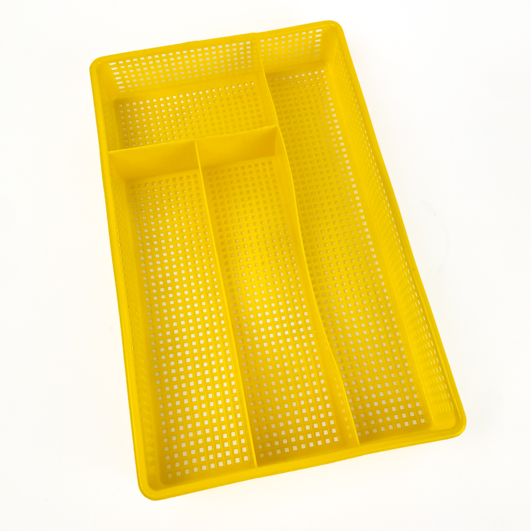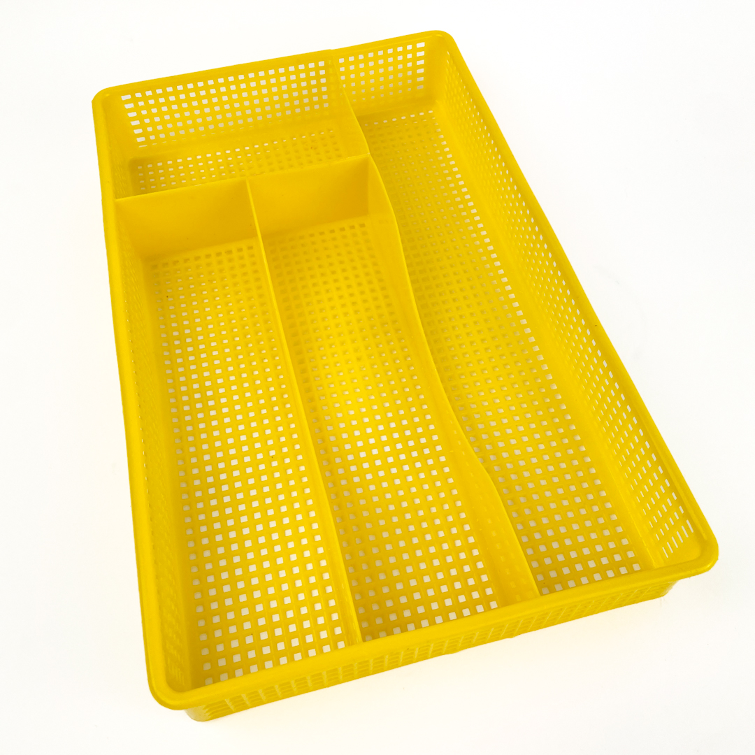 Fin gul retro bestikbakke i perforeret plast med fire rum.