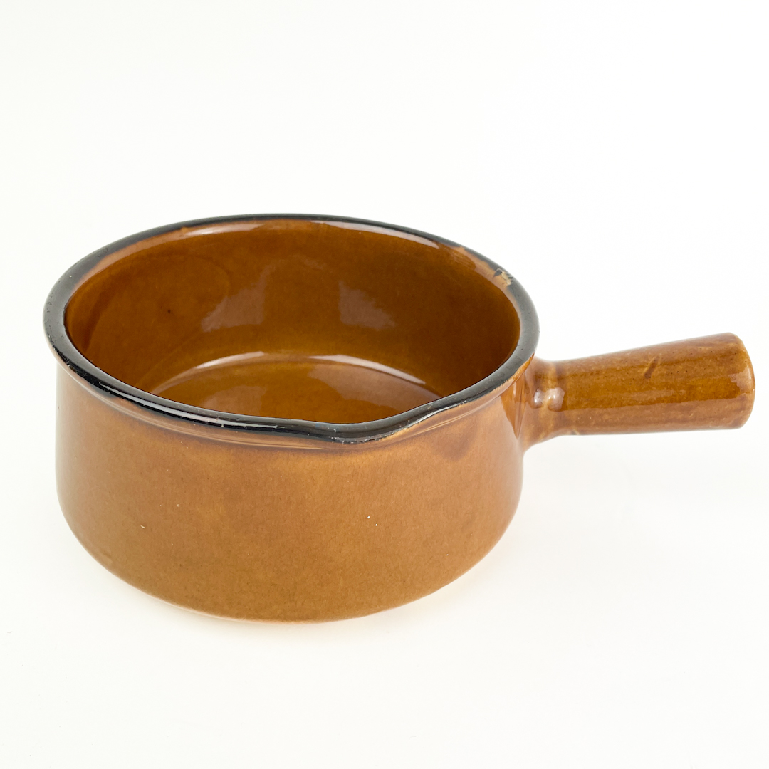Flot ildfast fad i brunt glaseret stentøj med hank.