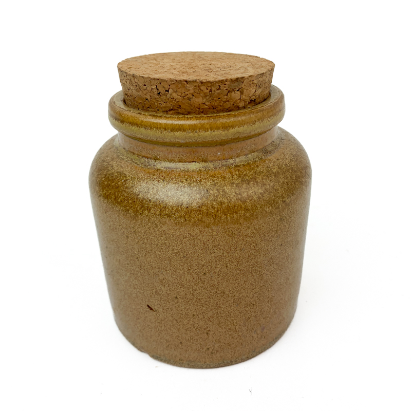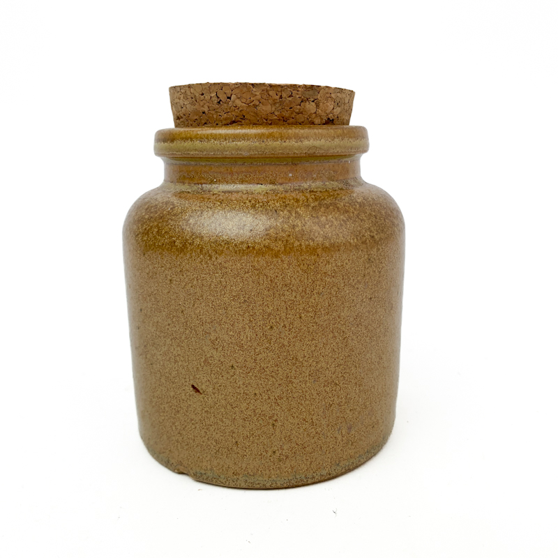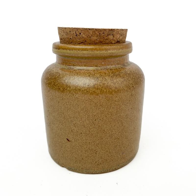 Fin lille stentøjskrukke i varme gyldne brune nuancer med original korkprop.