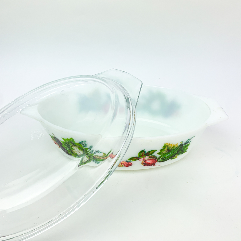 Smuk hvid ildfast glasskål i opalglas med farverigt grøntsagsmotiv langs kanten.