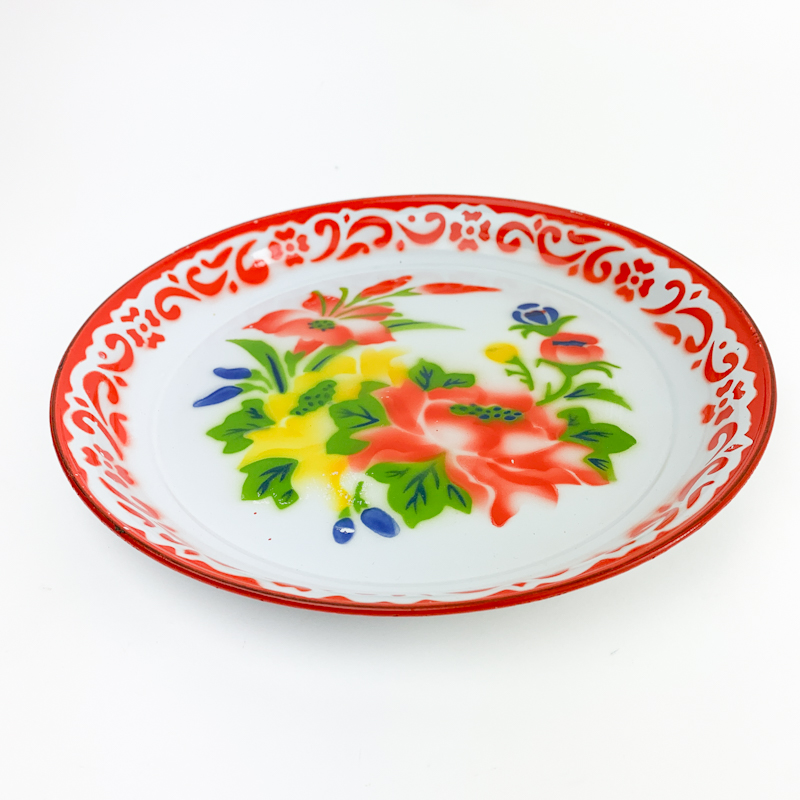 Dette farverige vintage emaljefad har et smukt blomstret motiv i klare røde, gule, grønne og blå nuancer.