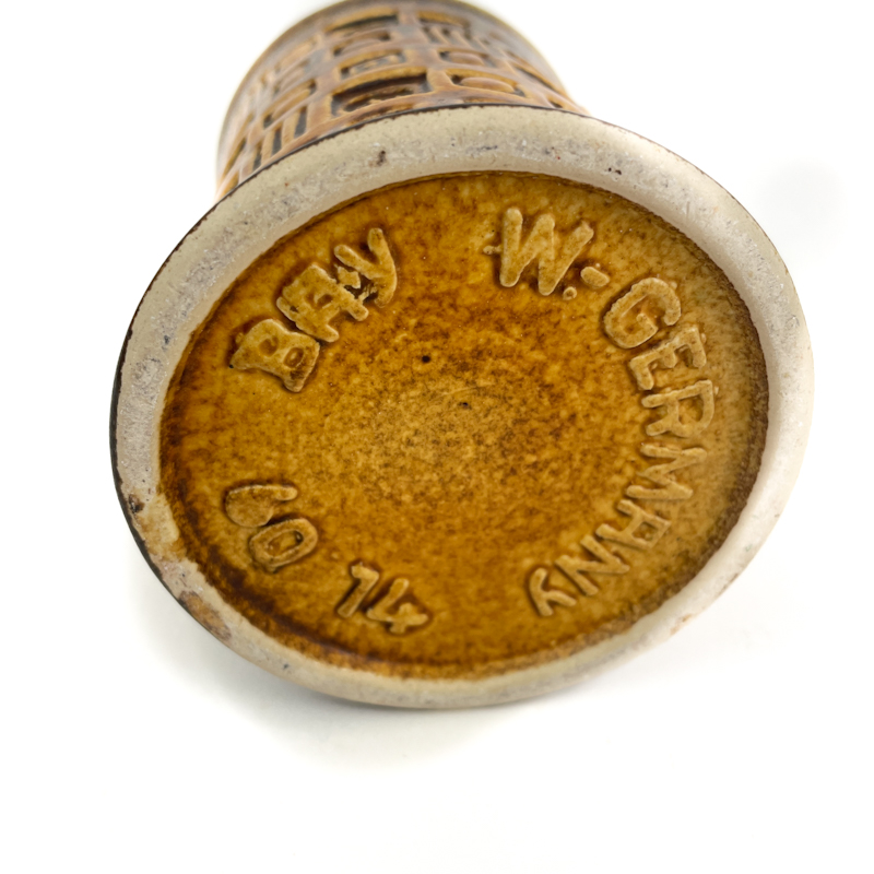 Smuk retro vase i glaseret stentøj fra Bay Keramik med grafisk reliefmønster i varme brune nuancer og grøn hals.