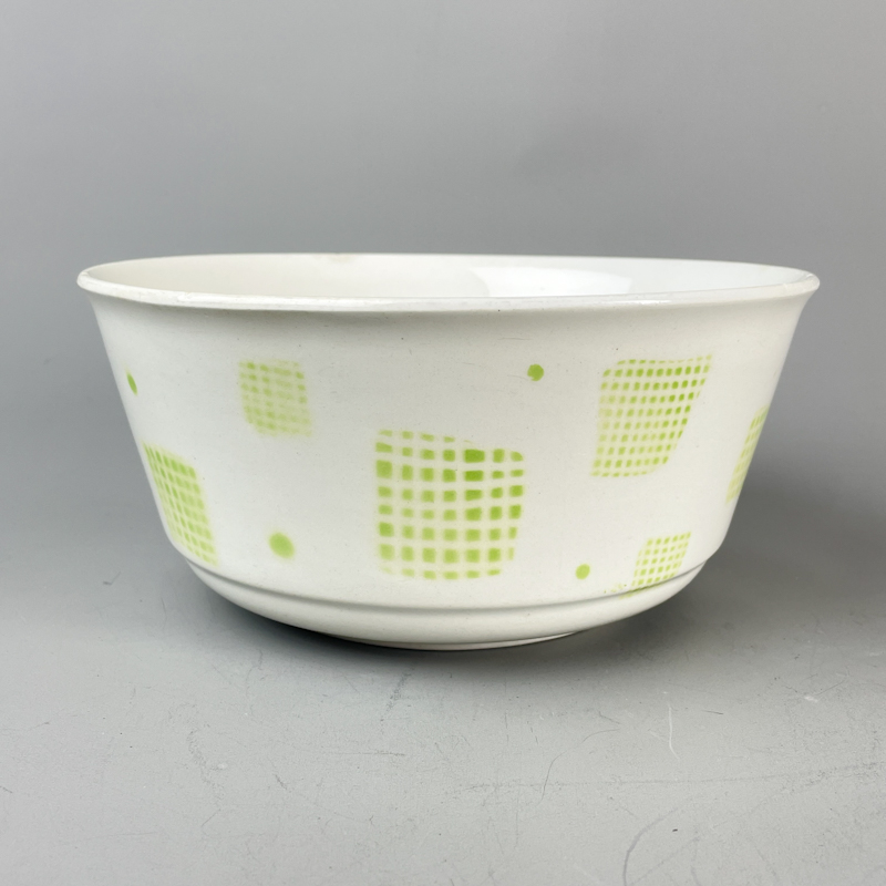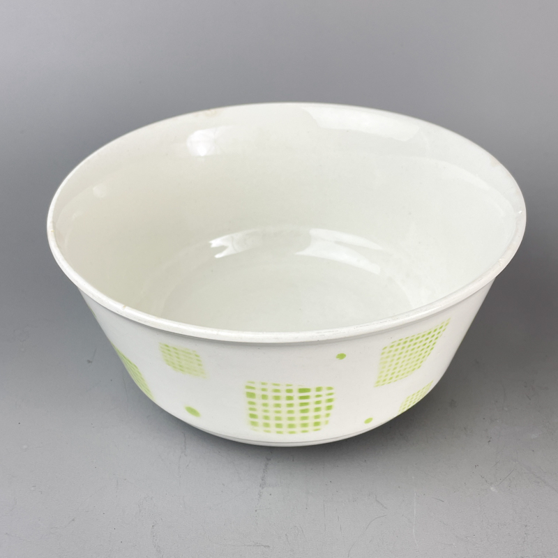 En smuk vintage salatskål i hvidt porcelæn med grafisk mønster i friske grønne felter.