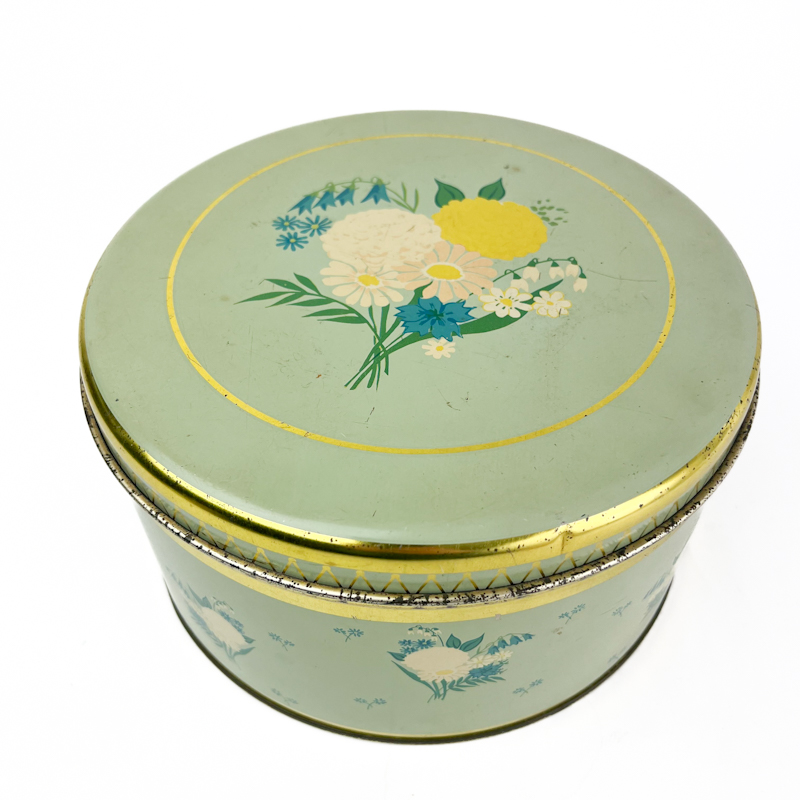 Smuk vintage kagedåse i lys mintgrøn med fine blomsterbuketter og gyldne detaljer.