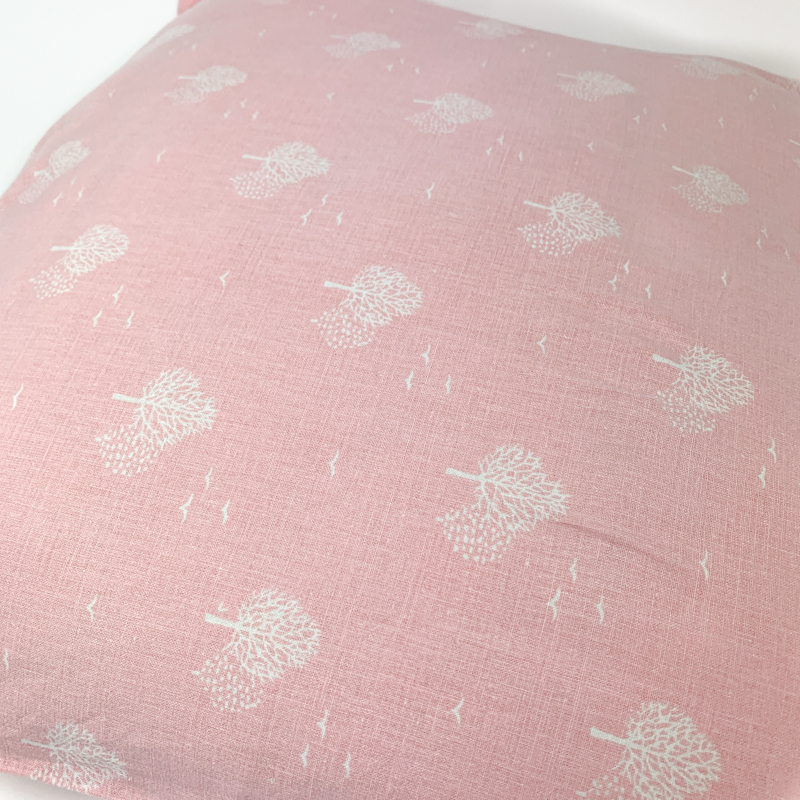 Smukt vintage pudebetræk i støvet rosa bomuld med fint tryk af hvide mælkebøtter og små flyvende frø.