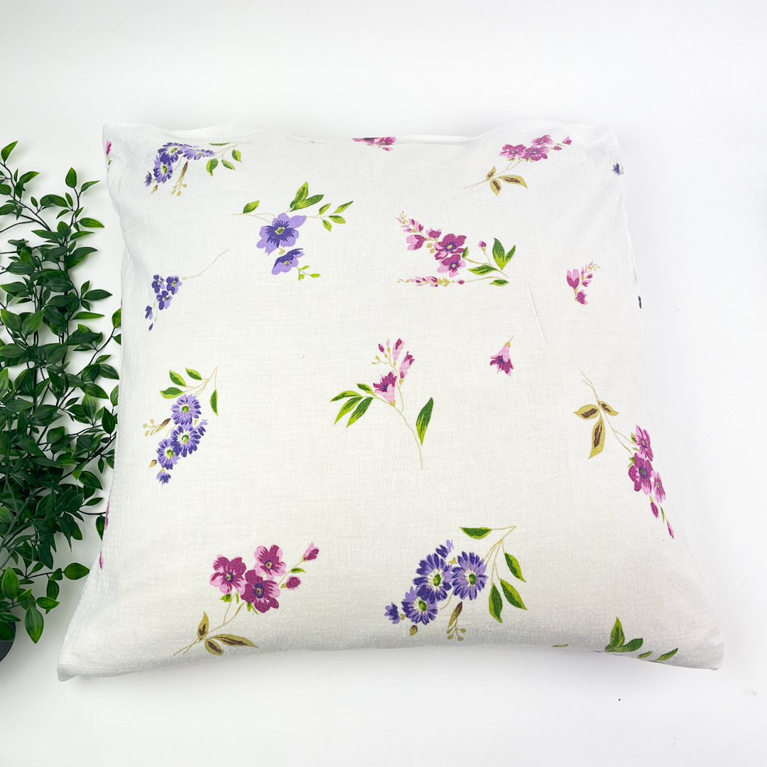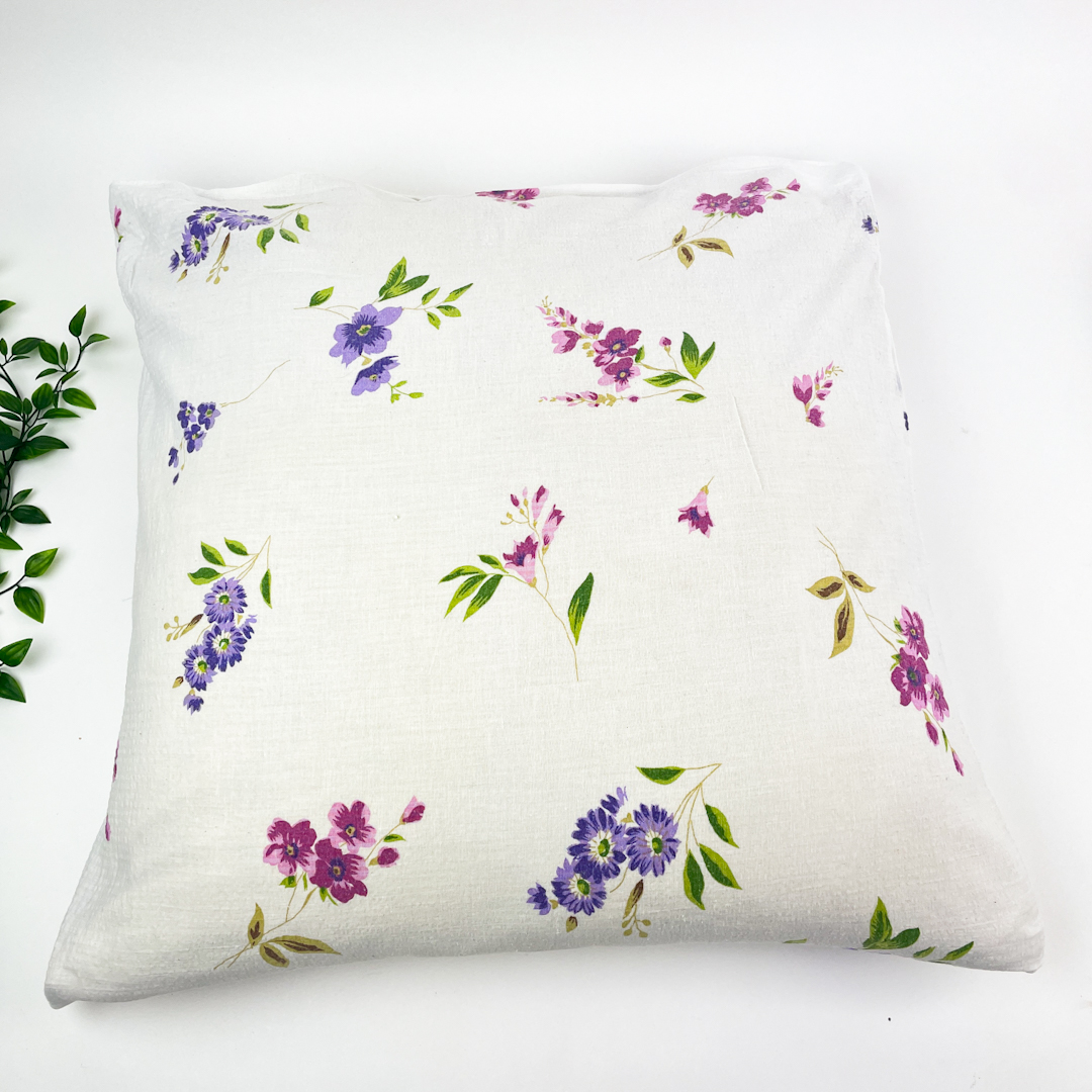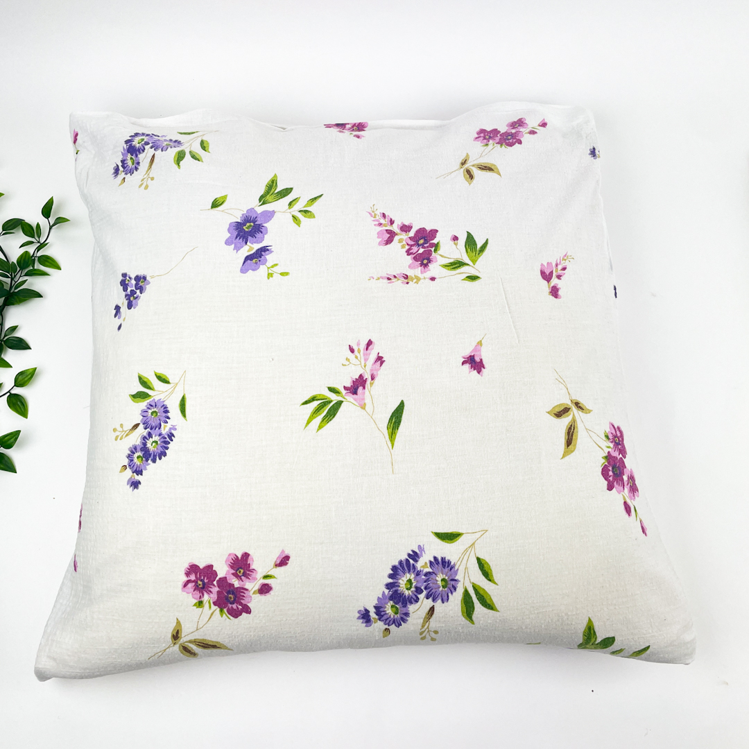Det er dekoreret med et let og elegant mønster af lilla og pink blomster med grønne blade på lys bund.