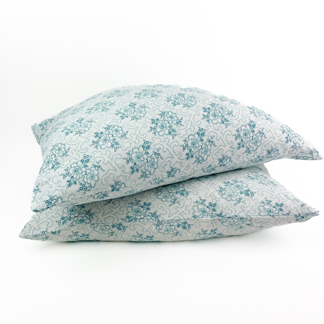 Betrækkene er dekoreret med et fint blomstermønster i blå nuancer på lys baggrund.