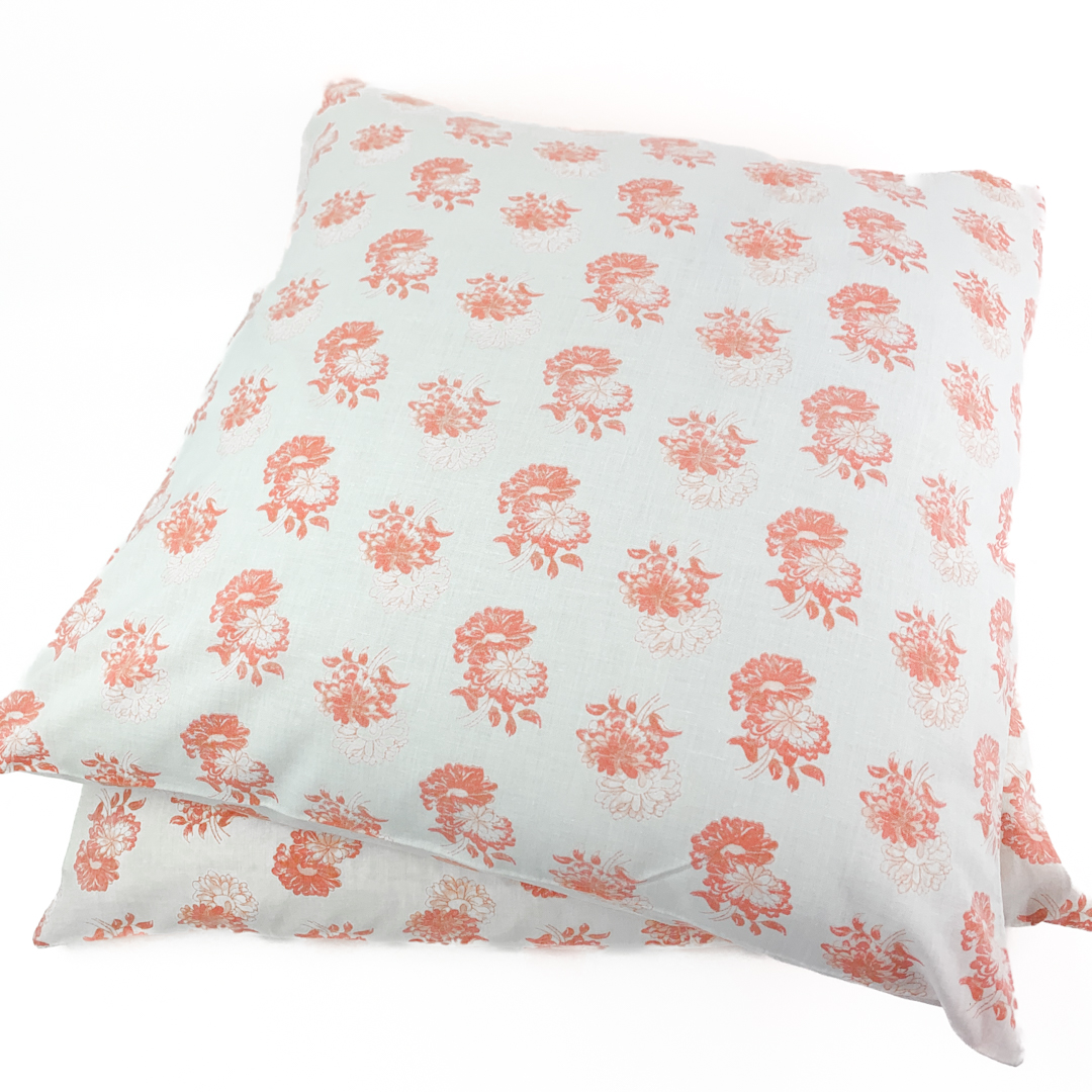Betrækkene har et smukt mønster med små orange blomster på lys baggrund.