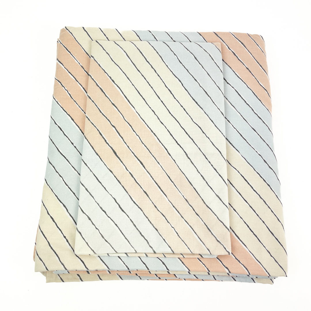 Sættet har brede diagonale striber i rosa, lyseblå og creme med sort kontur, som giver et flot og tidstypisk udtryk fra 1970’erne.