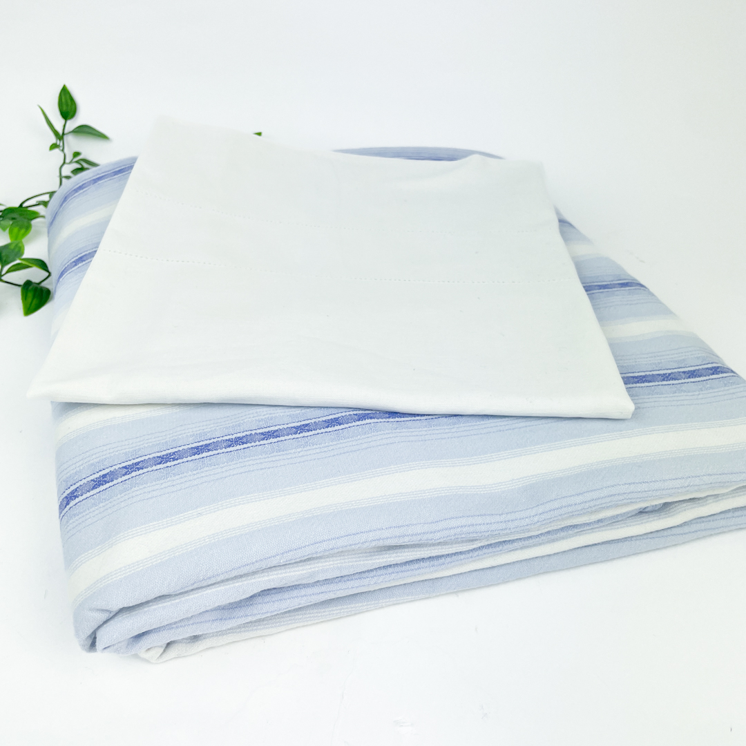 Flot vintage sengesæt i lyseblå og hvide striber med fine detaljer i mønsteret.