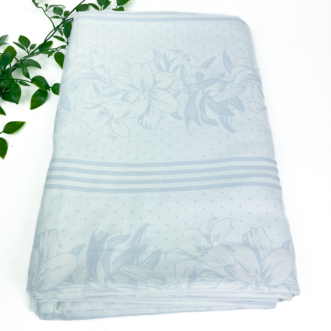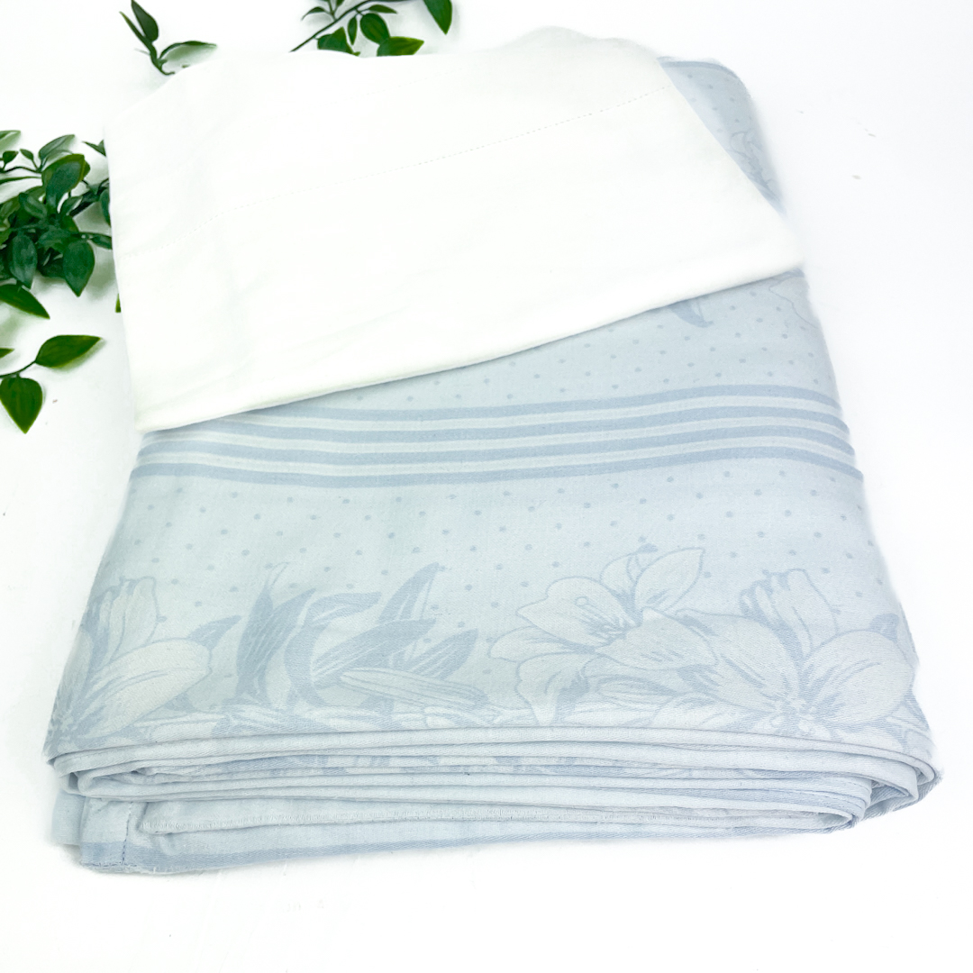 Smukt vintage sengetøj i lyseblå damask med elegant blomstermønster.