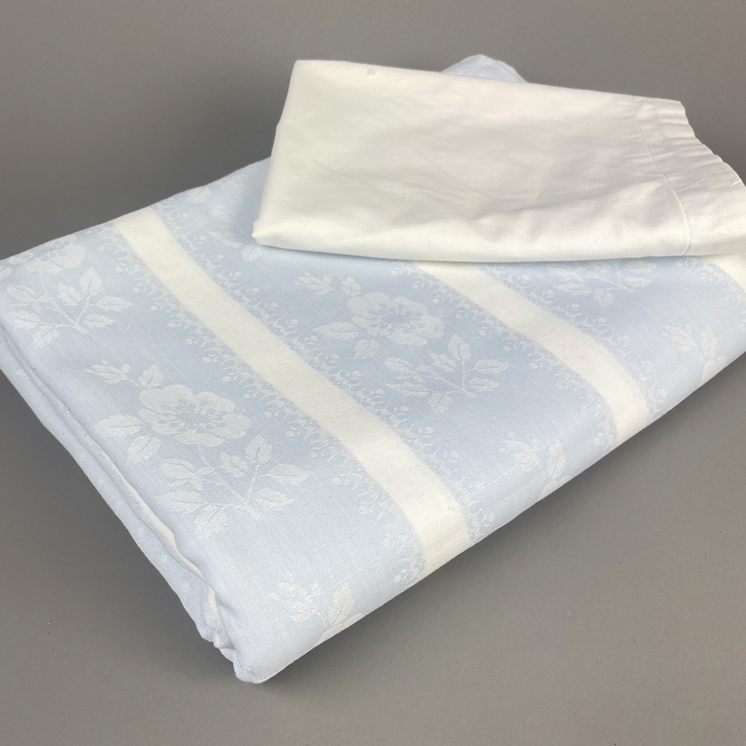 Smukt vintage sengetøj i lyseblå og hvide striber og hvidt pudebetræk.