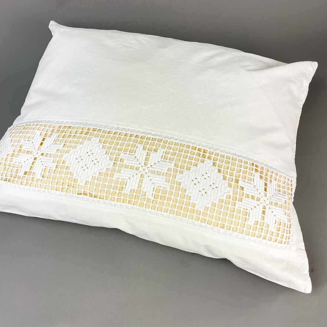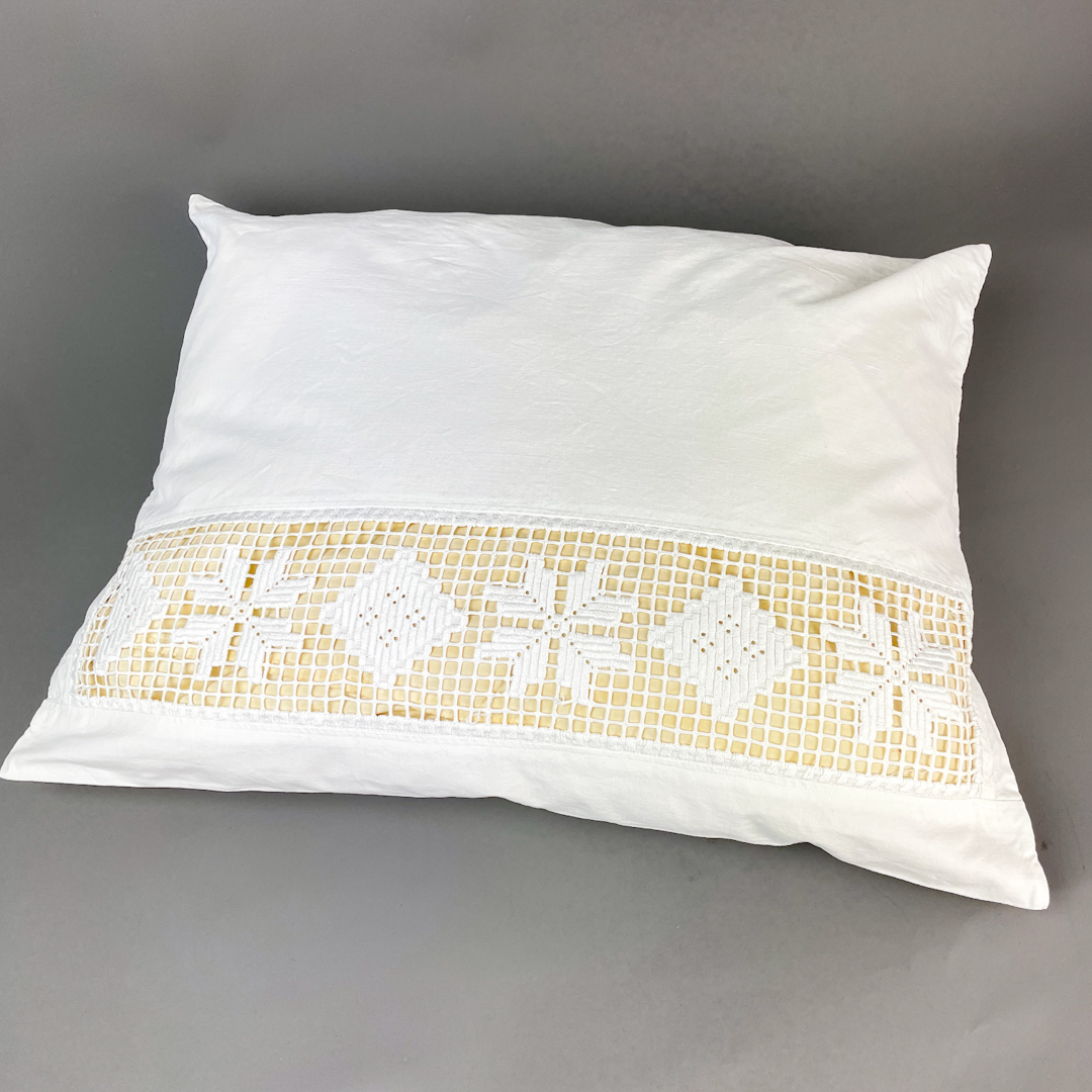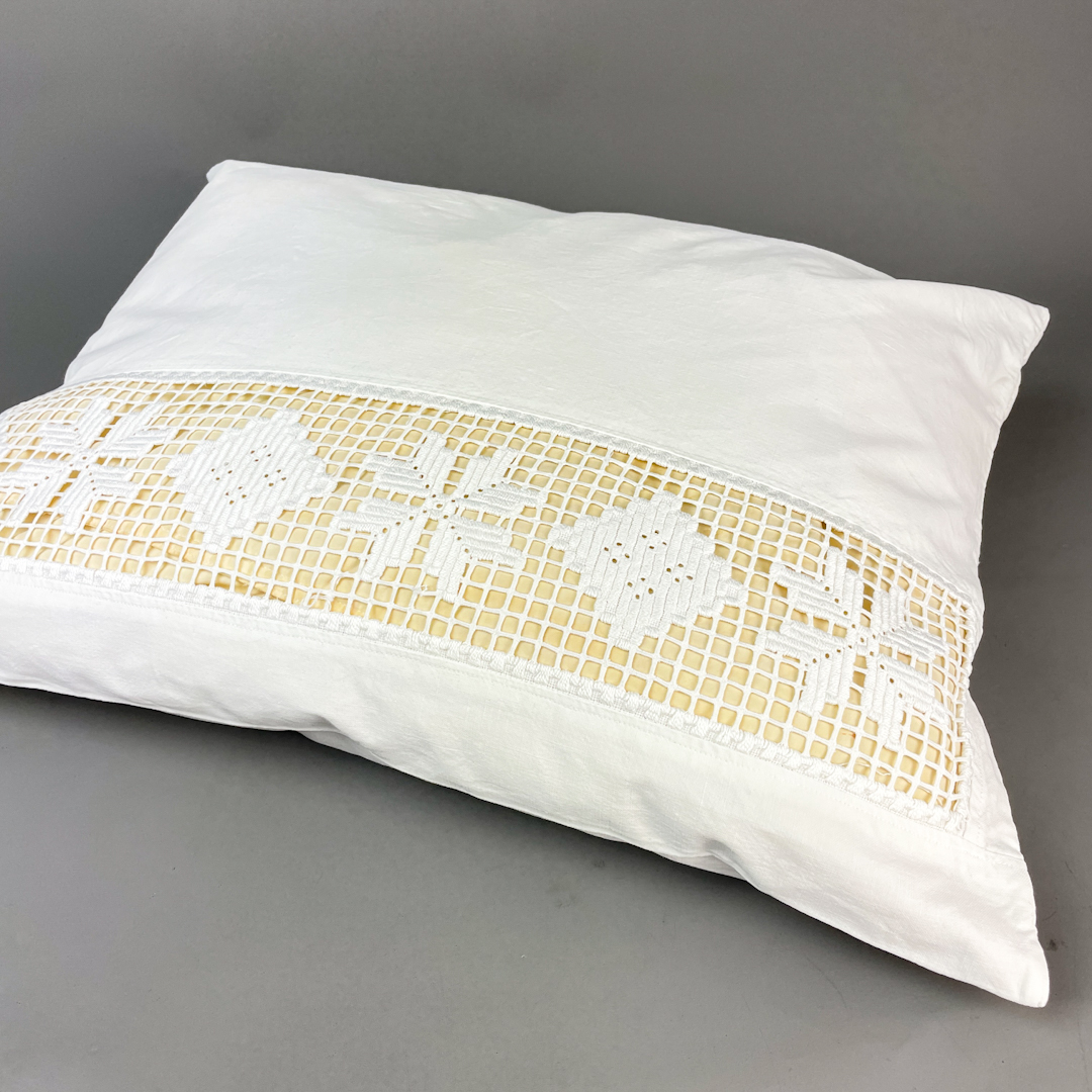 Smukt hvidt pudebetræk i ren bomuld med bred mellemværk og monogram Det måler 60 x 64 cm og fremstår i flot stand uden pletter, slid eller skader.