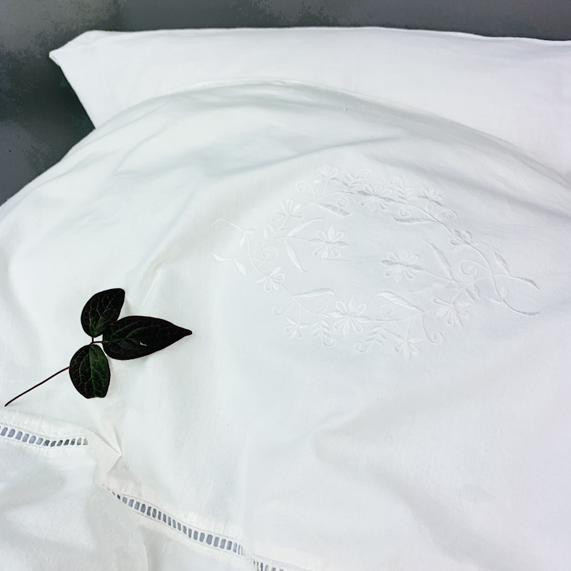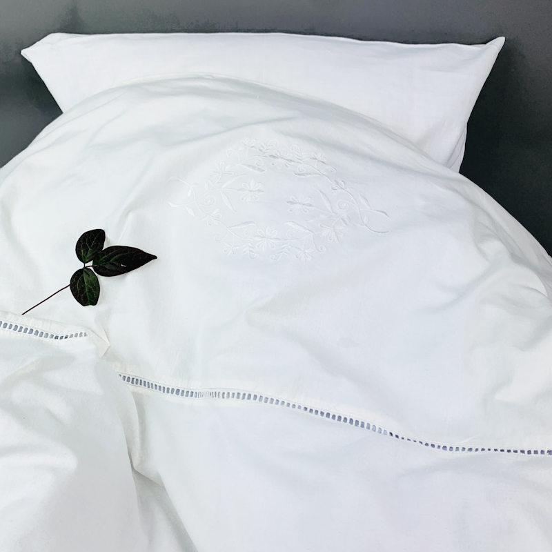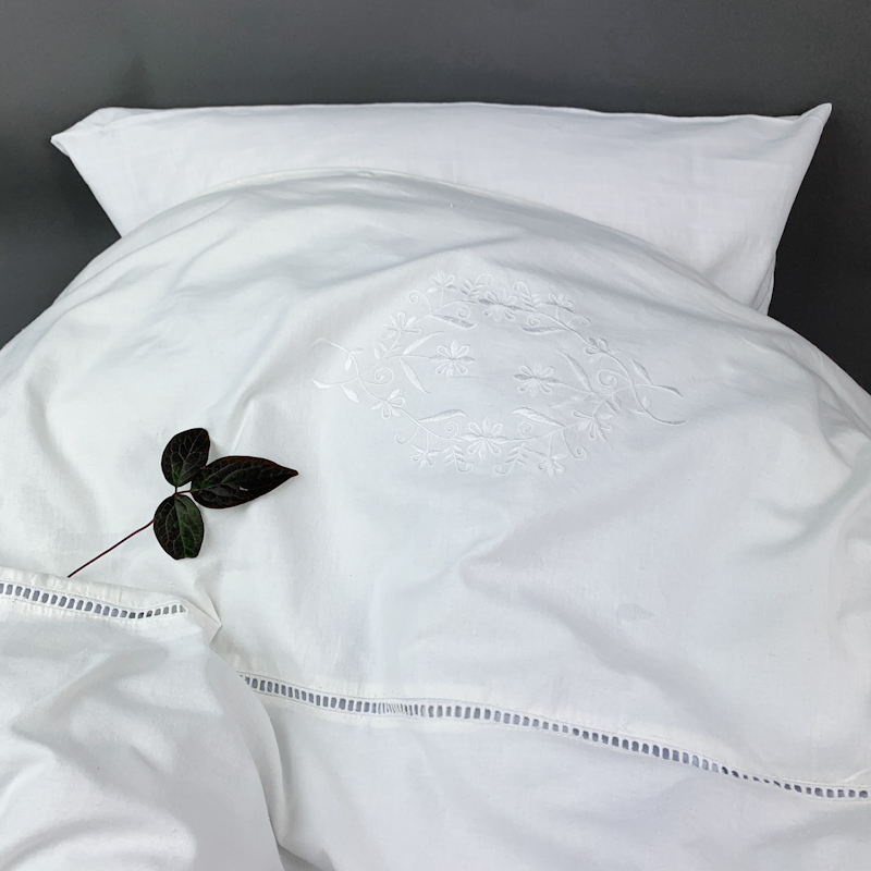 Smukt hvidt sæt vintage sengetøj i ren bomuld med fint håndbroderet blomsterkrans og broderet åbent bort på tværs af dynebetrækket og med glat pudebetræk.