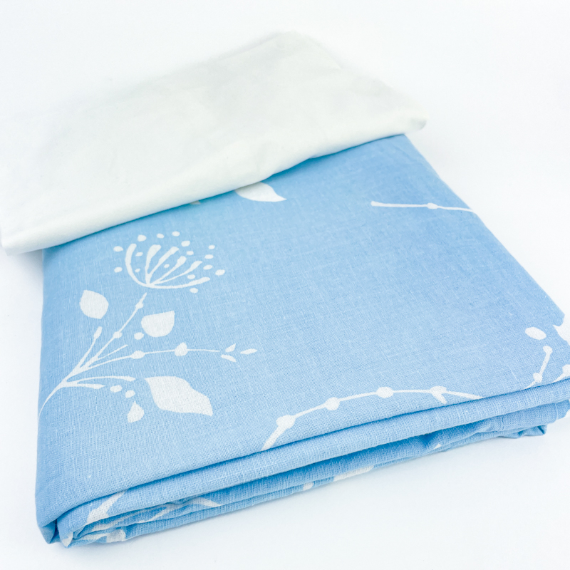 Smukt retro sengesæt i lyseblå farve med hvidt, grafisk blomstermønster.