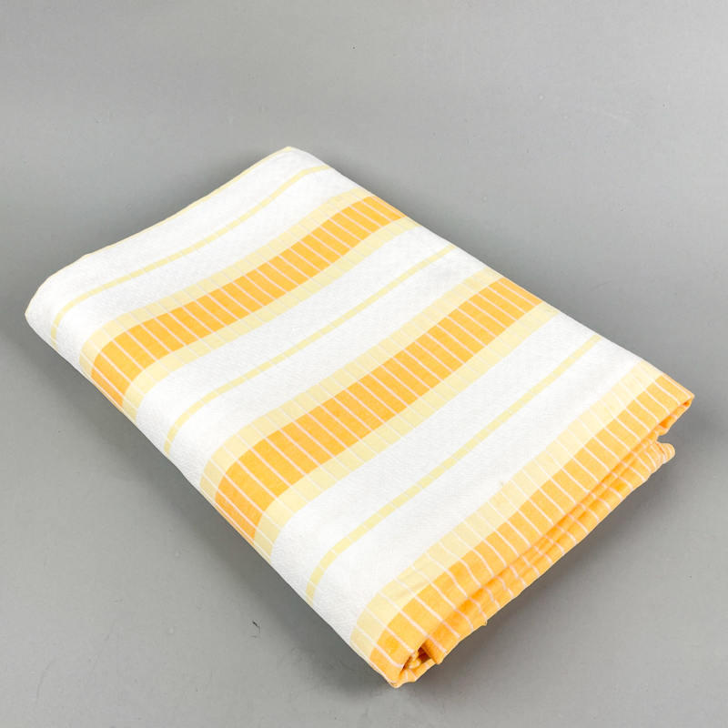 Retro sengetøj i hvid bomuld med striber i klare gule nuancer.