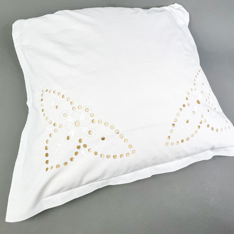 Hvidt vintage pudebetræk i ren bomuld med smukt gammelt håndarbejde.