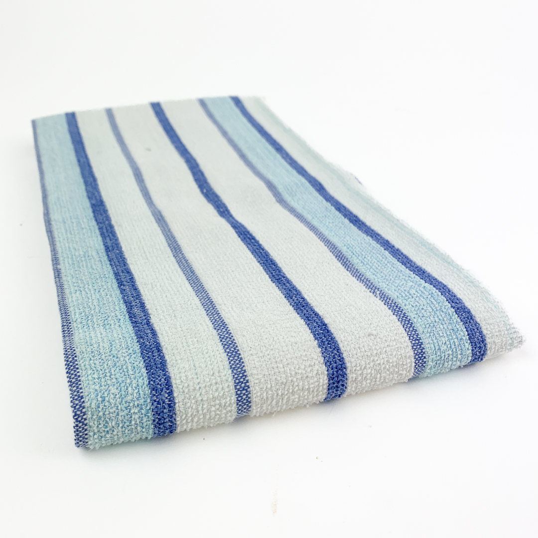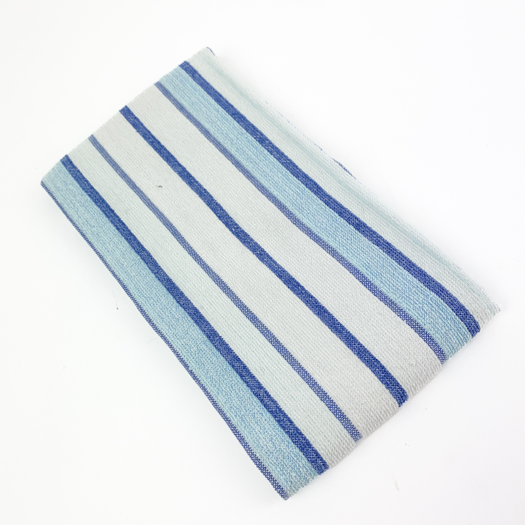 Dekoreret med klassiske striber i lyseblå og mørkeblå nuancer.