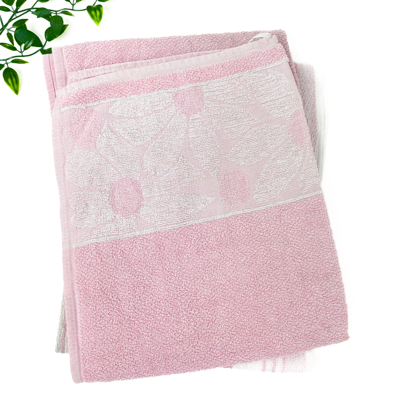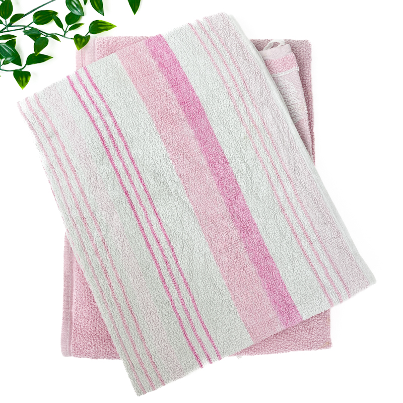 Sæt med to vintage håndklæder i rosa og lyse nuancer med vævet mønster og striber.