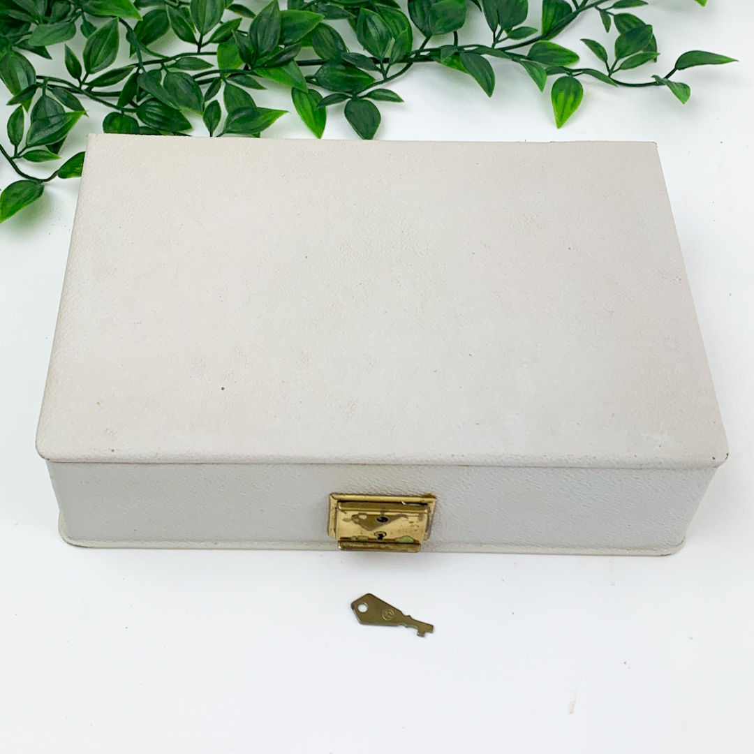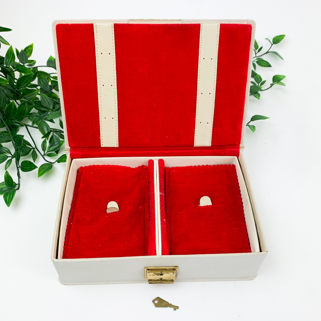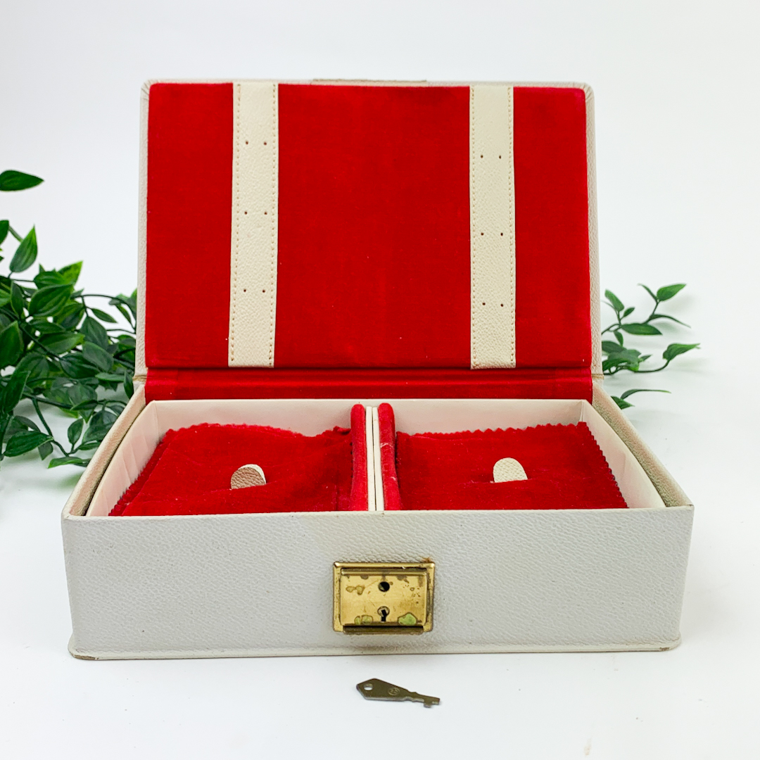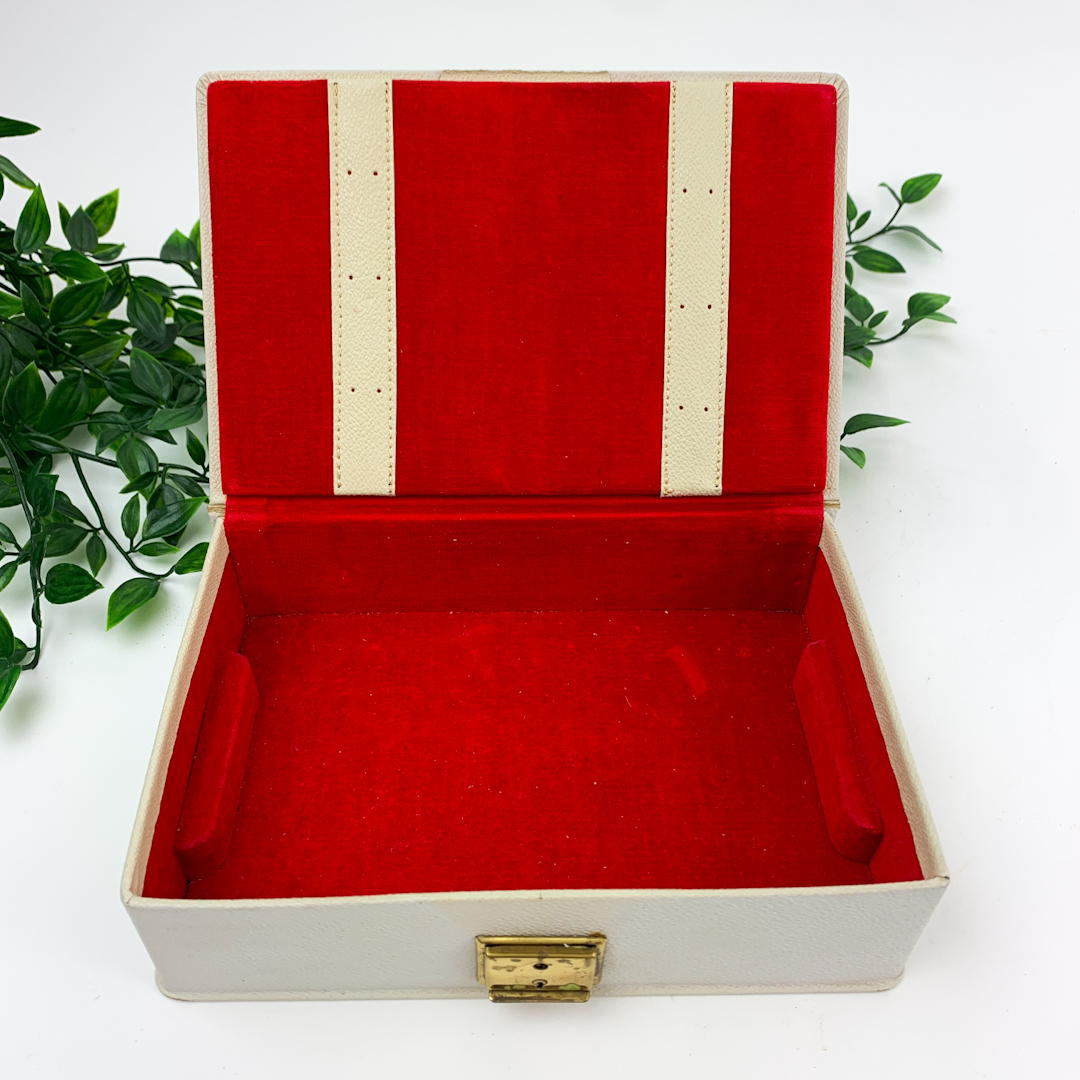 Elegant smykkeskrin beklædt med lyst kunstlæder og rødt velour indvendigt.