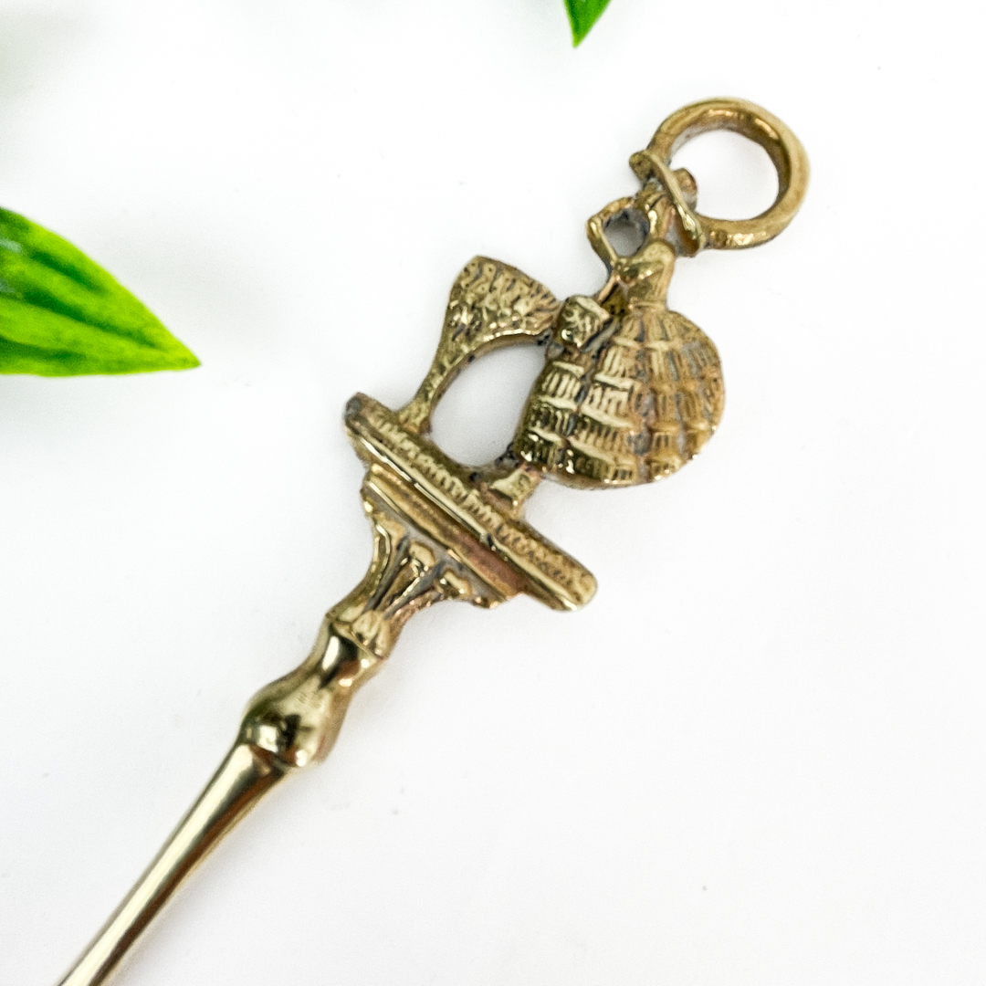 Håndtaget er dekoreret med motiv af en dame i kjole og hat, hvilket giver et dekorativt og klassisk udtryk.