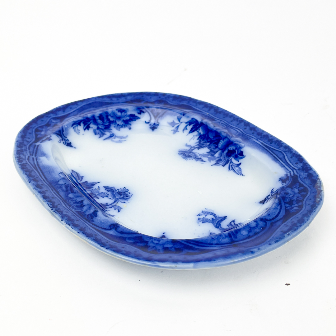 Dekoreret med klassiske blomster og fine border i dybblå transferdekoration, typisk for perioden omkring år 1900.