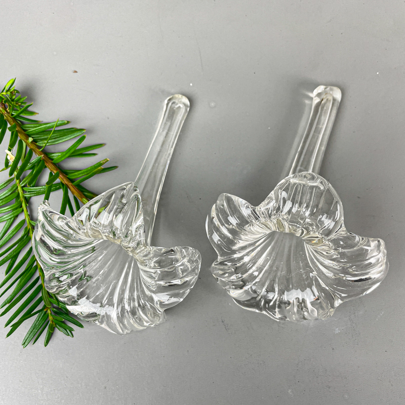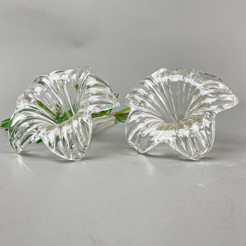 Smukke vintage glasblomster i klart håndformet glas med bølgede kronblade og organisk form.