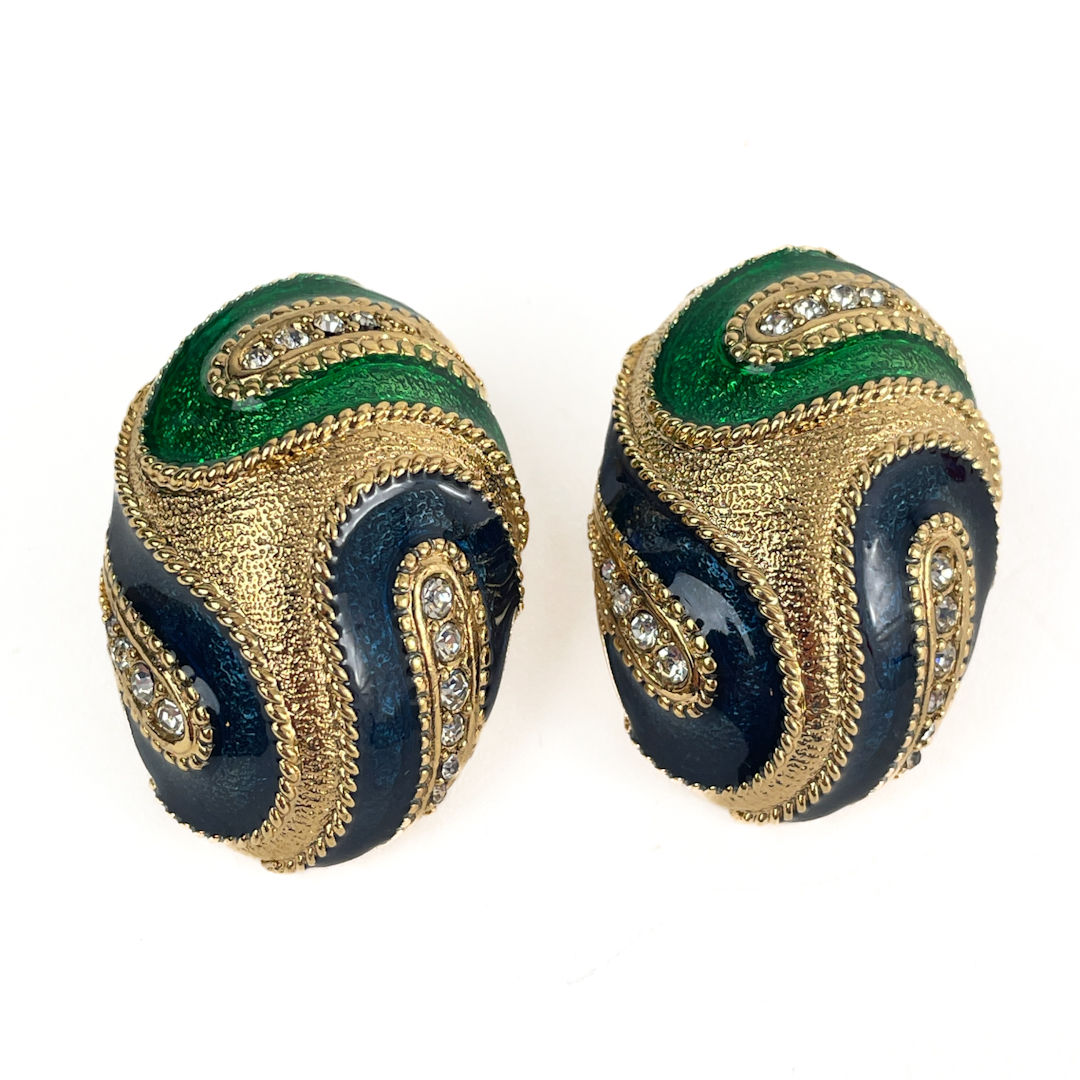 Elegante ovale øreclips i grøn og mørkeblå emalje.