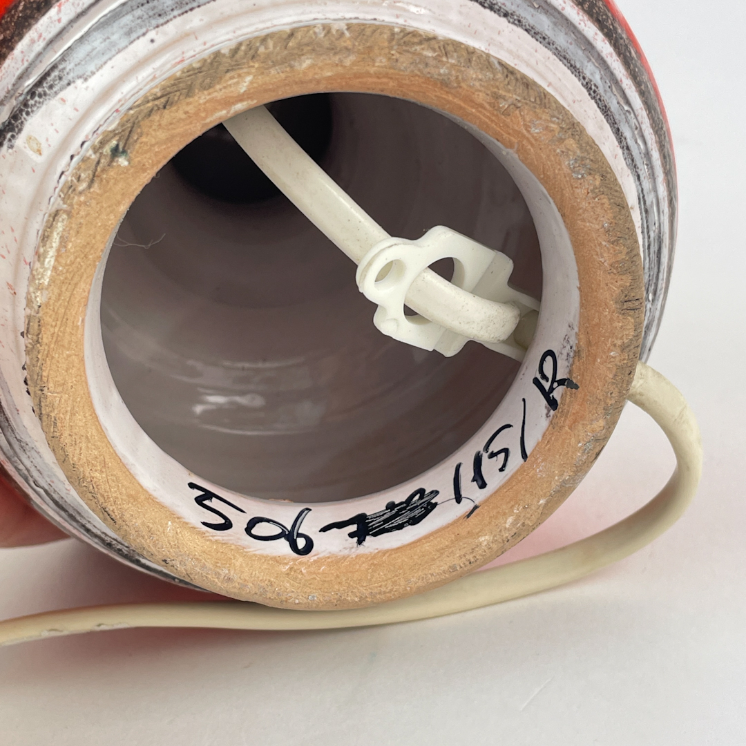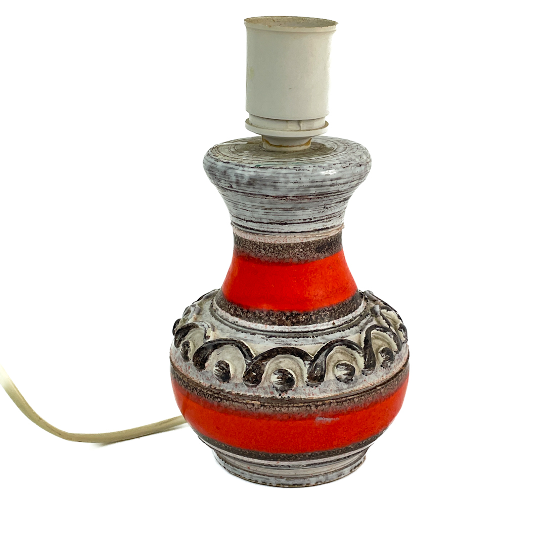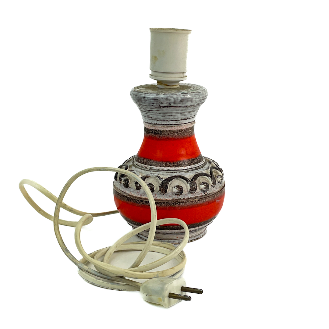 Flot vintage keramiklampe fra West Germany med karakteristisk mønstret relief og glansfuld glasur i orange og grå nuancer.