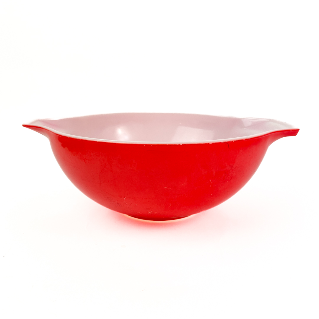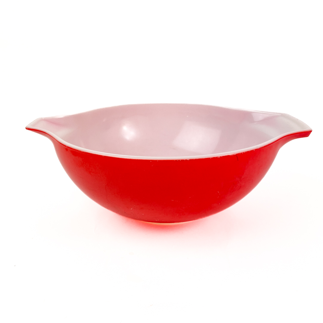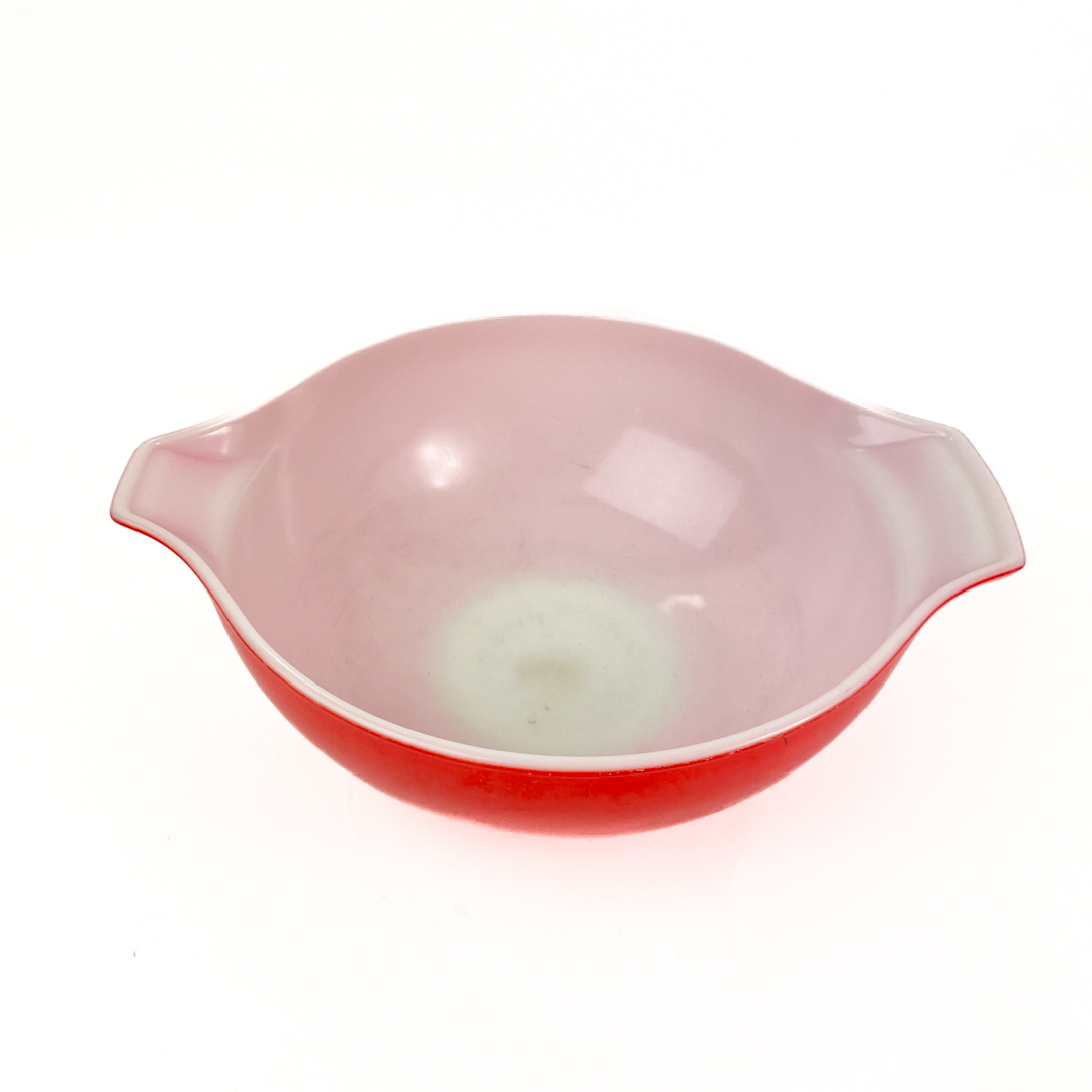 Flot rund vintage glasskål i rødt glas med hvid inderside.