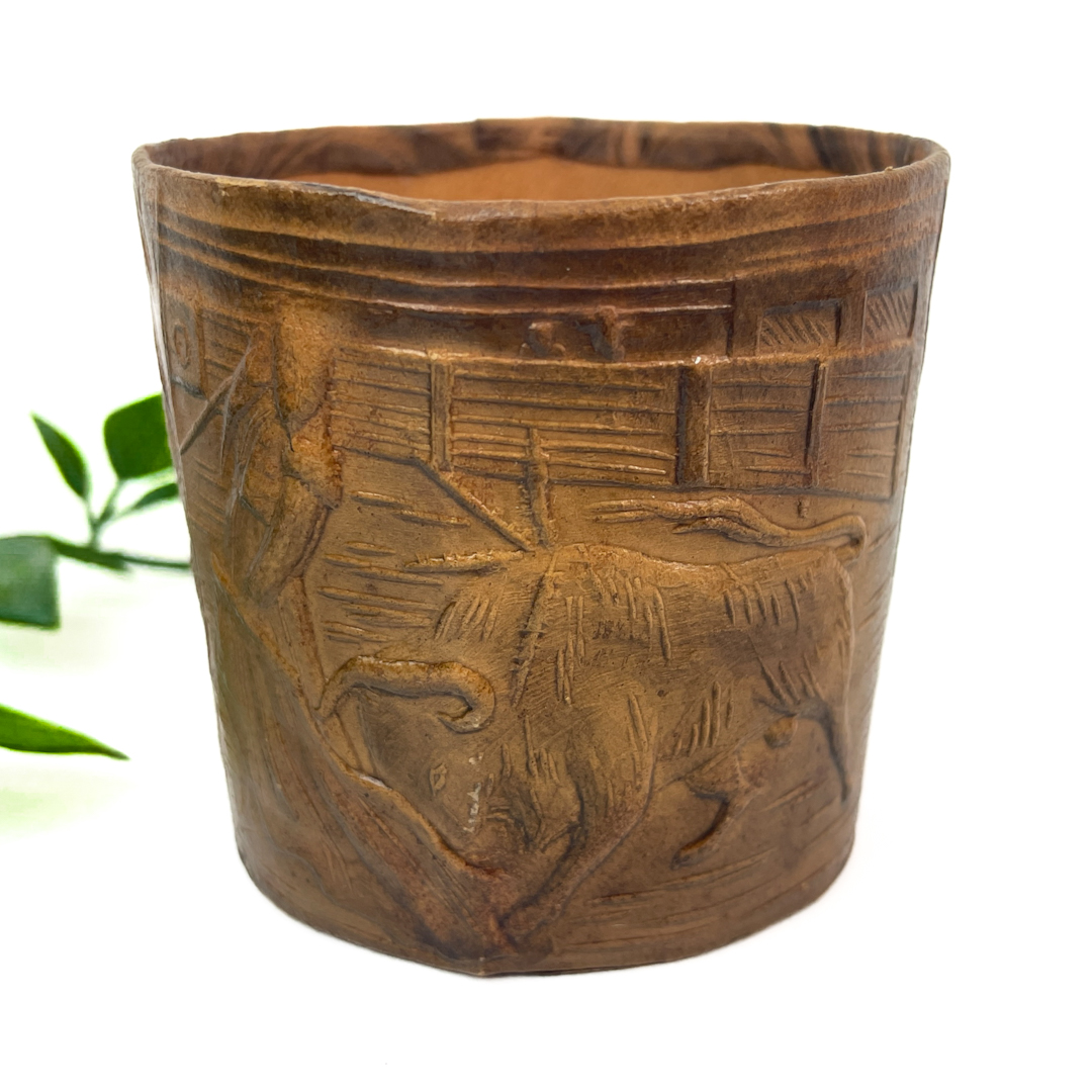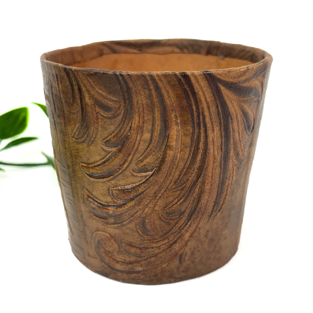 Smukt lille krus fremstillet i præget læder med motiv i relief.