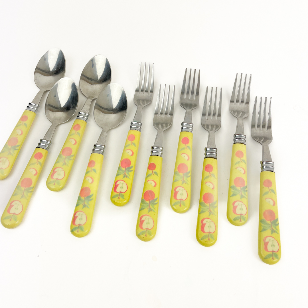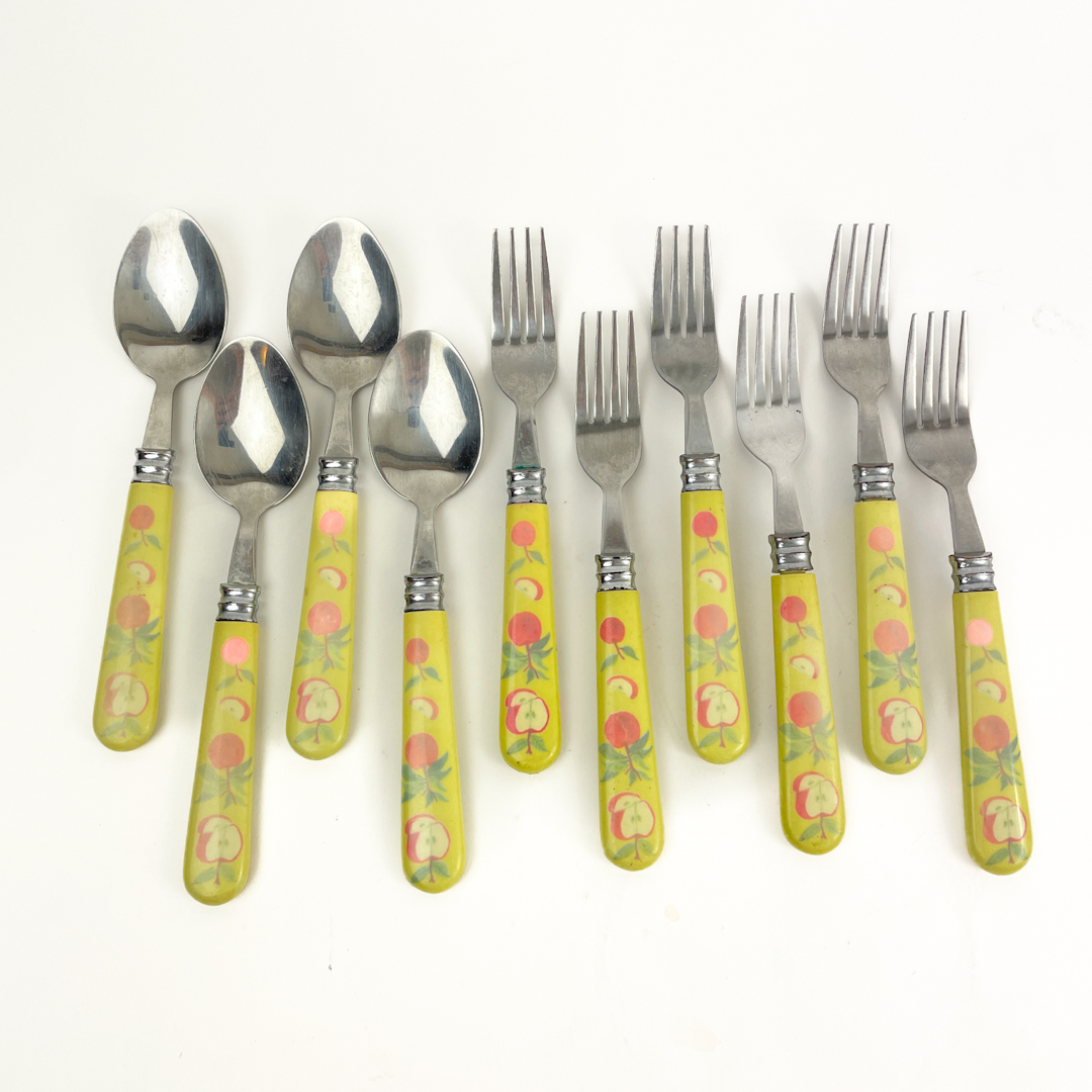 Farverigt retro bestik bestående af fem gafler og fem skeer.