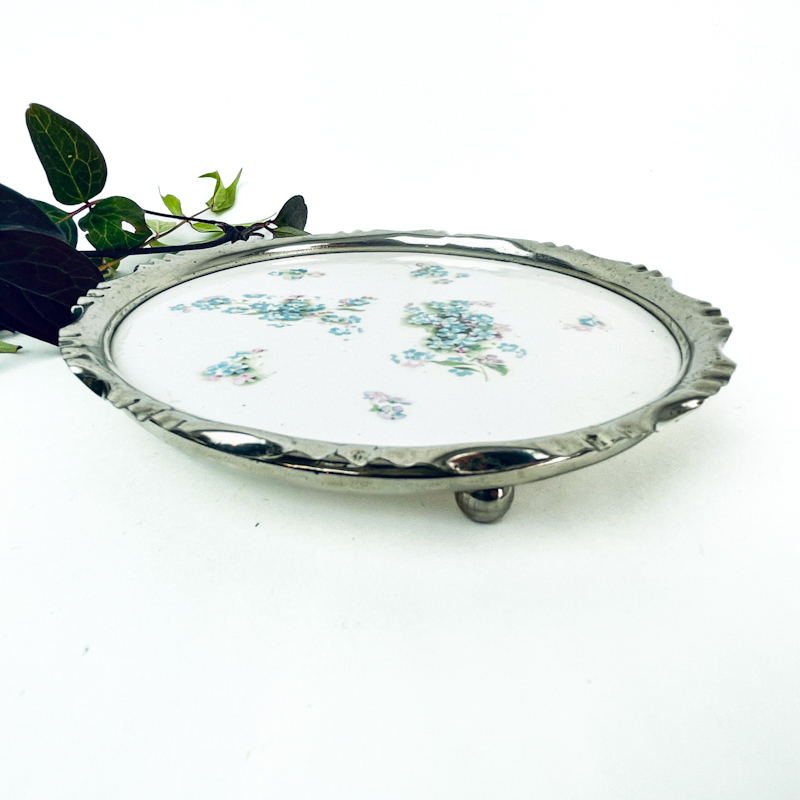 Fin lille vintage flaskebakke med porcelænsplade dekoreret med blå og rosa blomster. Kanten er i sølvfarvet metal med let bølget form og små fødder. Bakken måler 12 cm i diameter og fremstår i flot stand uden skader.