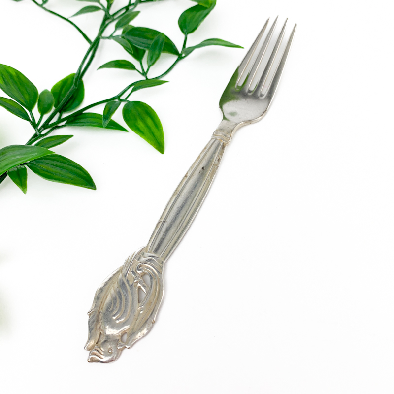 Sølvplet gaffel med smuk reliefdekoration og elegant form.