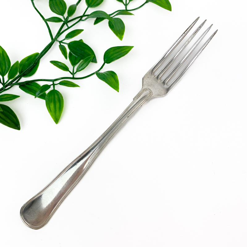 Middagsgaffel, 20 cm lang, totårnet sølv fra danske Cohr med smal riflet mønster rundt langs kanten.