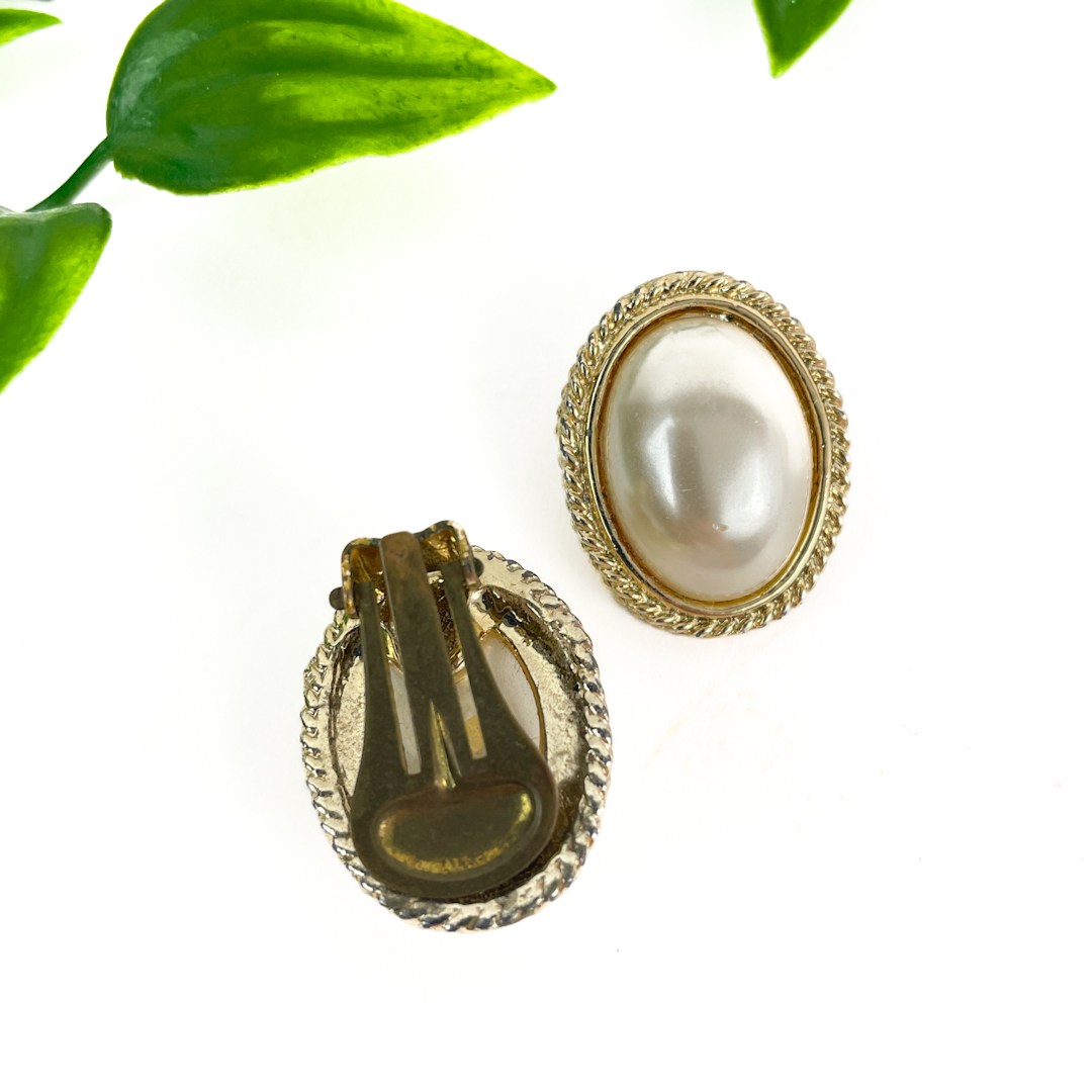 Elegante ovale vintage øreclips med smuk perlemorshvid cabochon og dekorativ gylden kant.