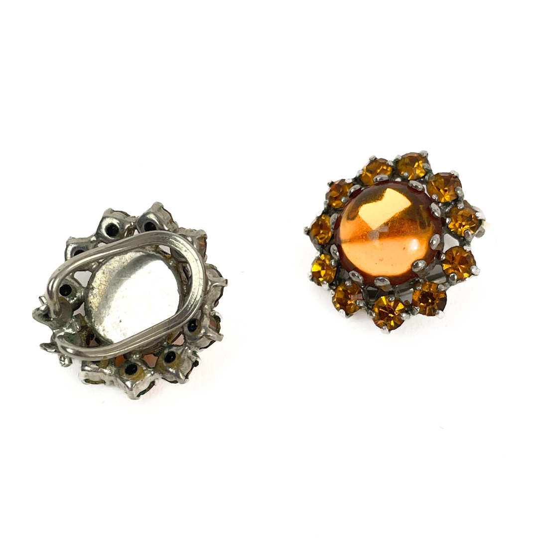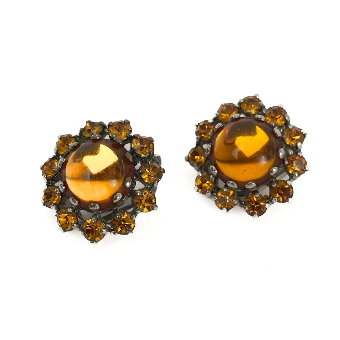 Smukke vintage clipsøreringe med store ravfarvede midtersten omgivet af funklende rhinsten i varme gyldne nuancer.