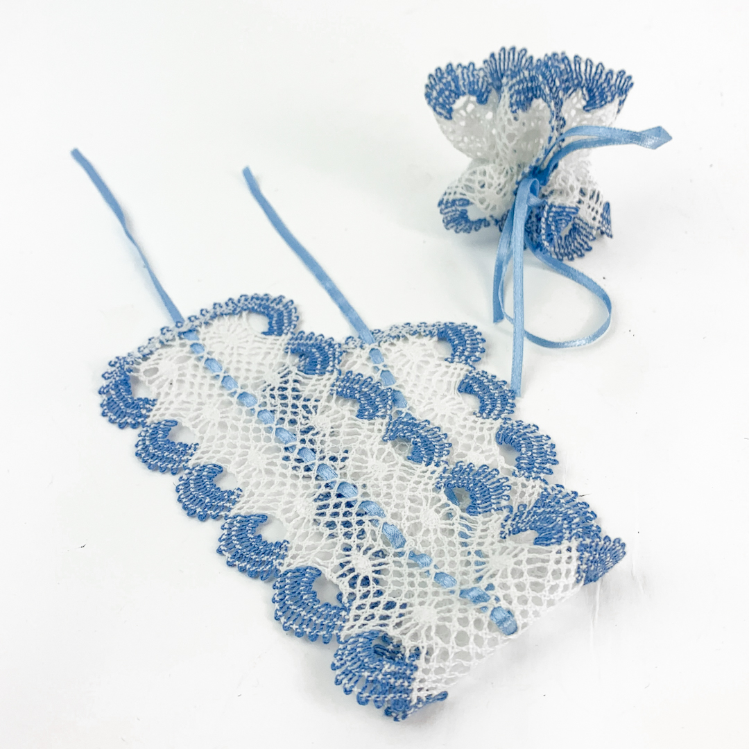 Smukke gamle lysmanchetter udført i hvid og blå knipling.