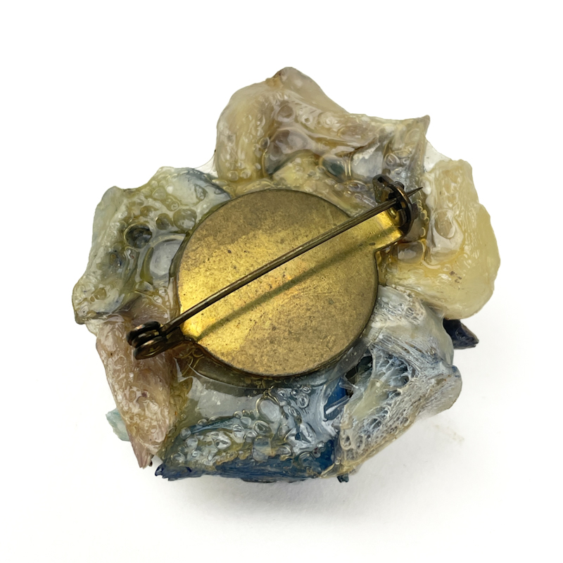 Vintage broche sammensat af uregelmæssige, farvede elementer i blå, grønne og lilla nuancer.